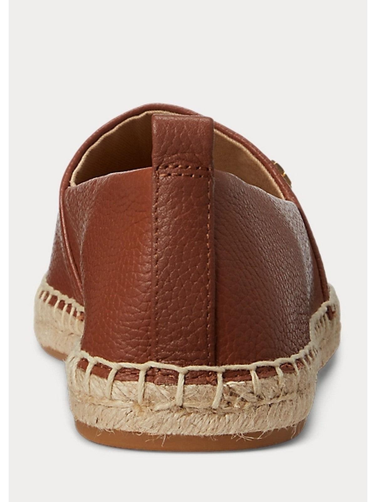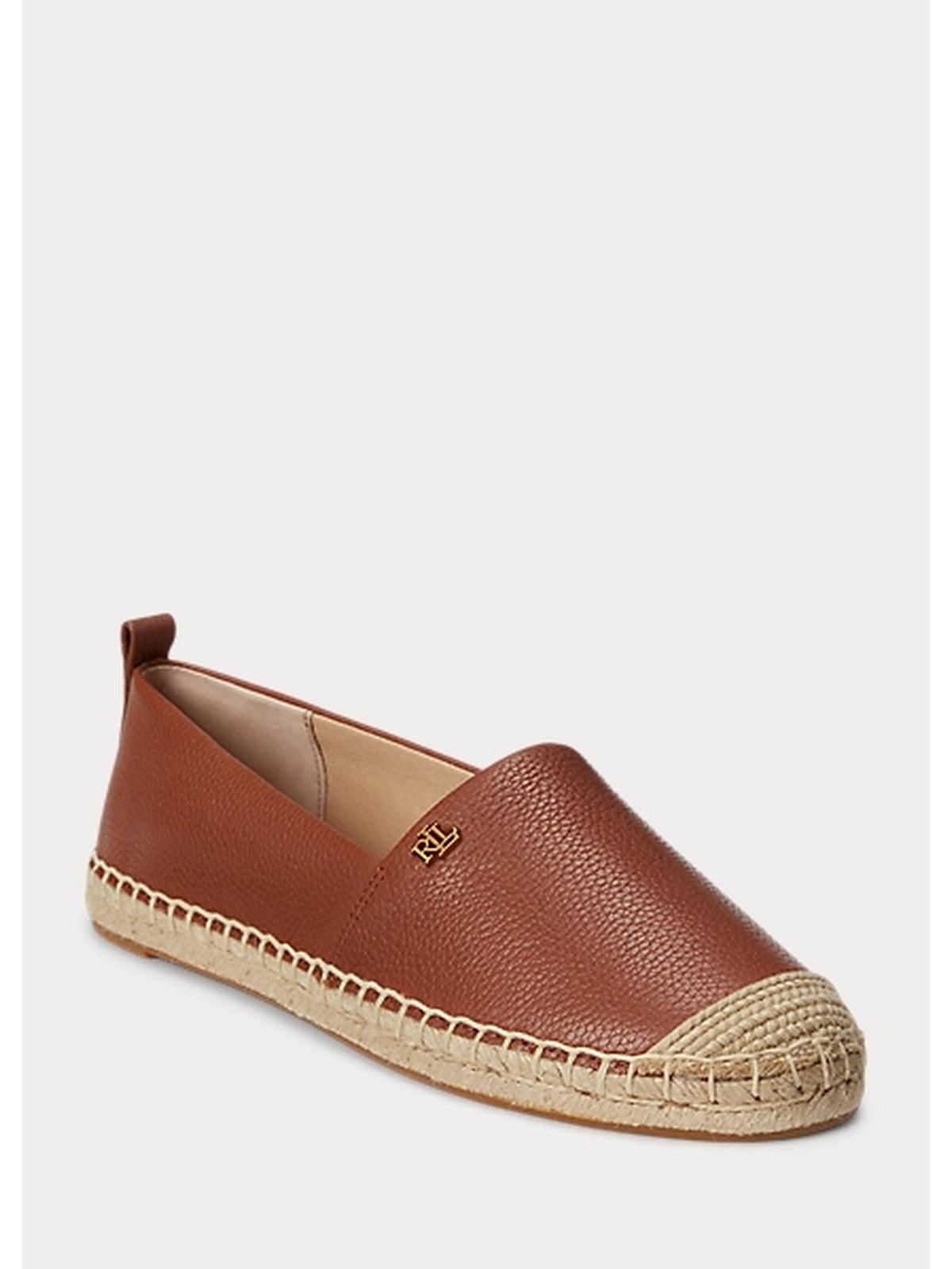 LAUREN RALPH LAUREN espadrilles made of fine hammered leather with reinforced cotton toe. "LRL" logo in shiny metal on the upper. Padded front and application on the heel with laminated "Lauren Ralph Lauren" logo print. Jute and rubber sole.