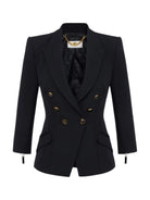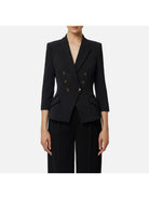 ELISABETTA FRANCHI slim-fit double crepe jacket. The blazer features structured shoulders, peak lapels, ¾ sleeves, and plackets with matching welts. The zips at the cuffs add unique details, while enamel buttons enhance the piece. Part of the Essential collection, for building the perfect wardrobe.