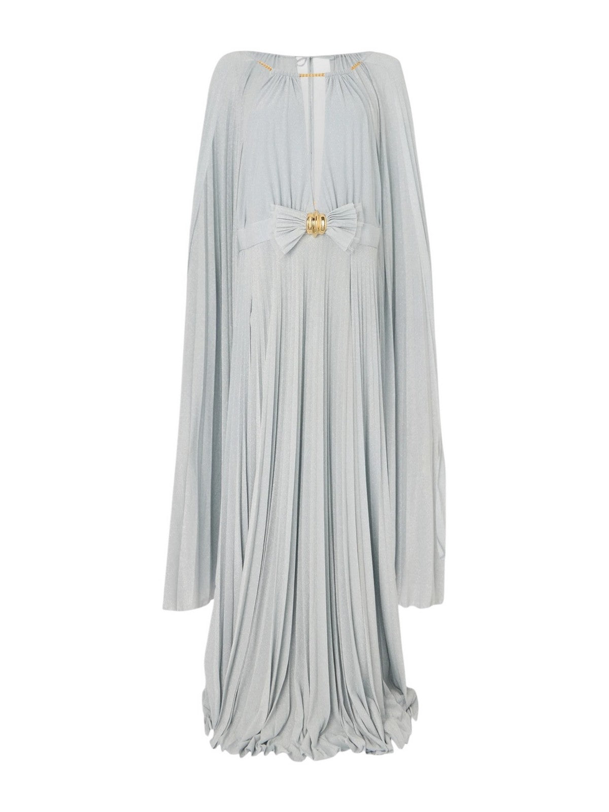 Complete the look with a pair of gold pumps and a matching clutch. The ensemble is perfect for an elegant event, combining sophistication and class in a timeless dress.
