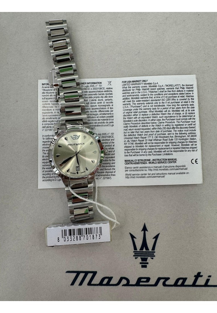 Enhance your style with the Philip Watch women's Corley R8253599510 watch. Part of the Corley collection, this just time watch embodies elegance and sophistication. With a steel case measuring 38x34mm and a thickness of 5.1mm, it offers a distinctive and modern design. The gold guilloché dial adds a touch of luxury and sophistication, while the sapphire crystal, treated for greater scratch resistance, ensures a sharp and clear view. The silver-colored steel strap, with a pin buckle closure, offers a comfortable and secure fit. Equipped with a reliable quartz movement, this watch is ready to keep up with your active lifestyle. With a water resistance of 5 atm, you can wear it with confidence during your daily activities. You will receive the official 2-year Philip Watch warranty and an original packaging, confirming the authenticity of your purchase. Choose the Philip Watch women's Corley R8253599510 watch and make a statement of timeless elegance.