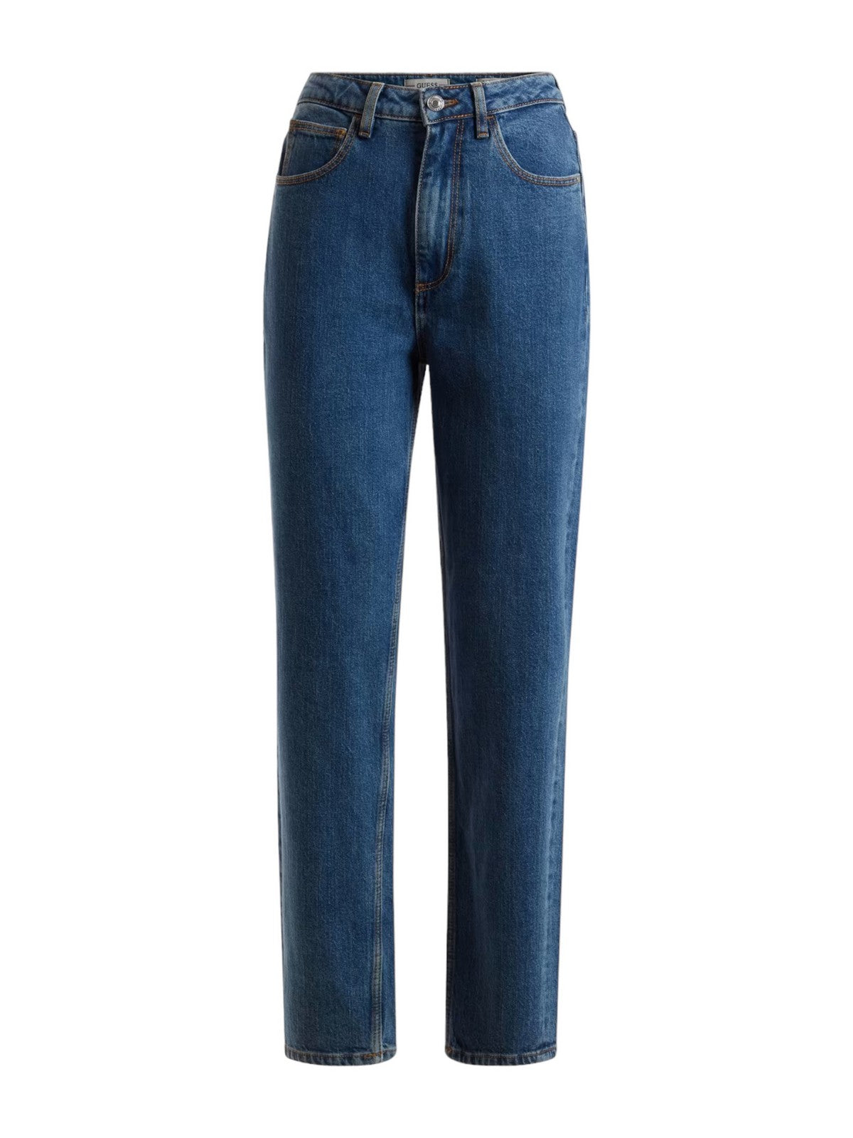 GUESS jeans in cotton denim. Mom fit five-pocket model. High waist. Ankle length. Button and zip closure.