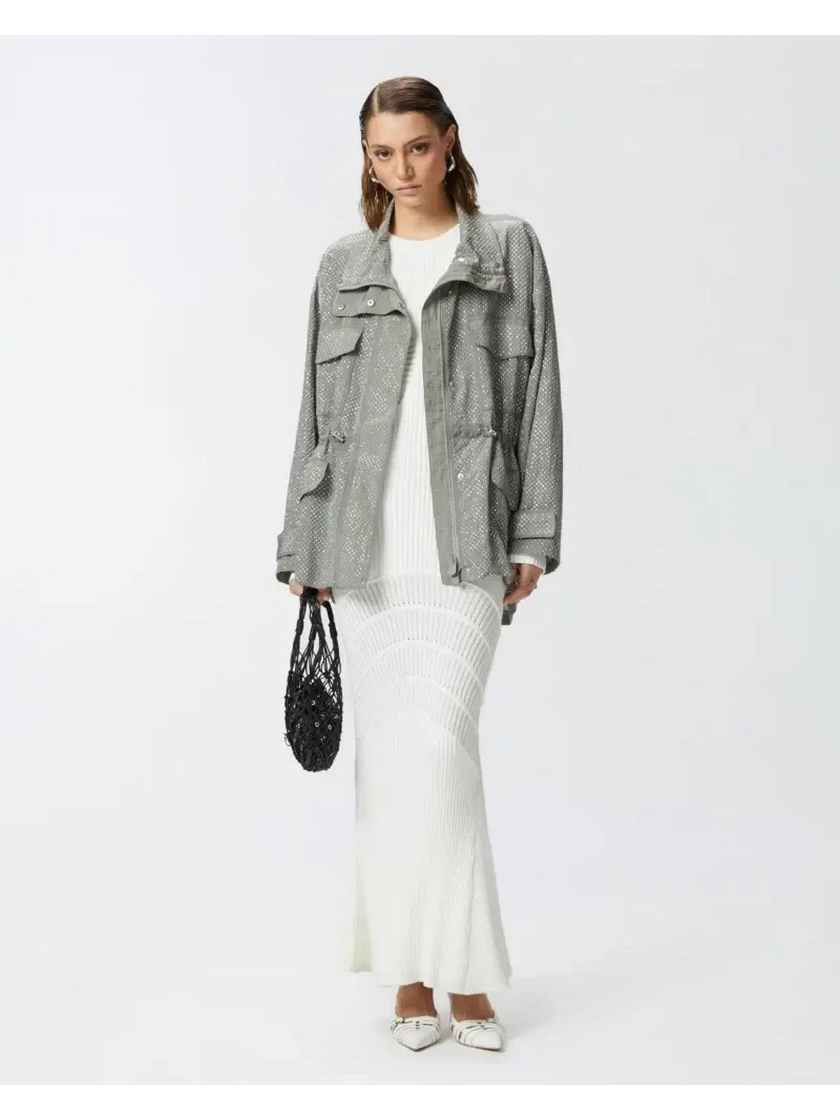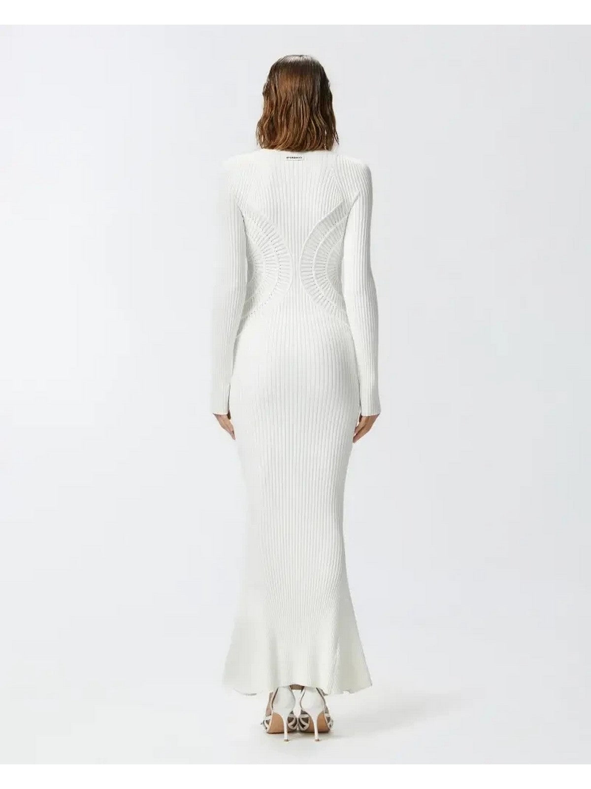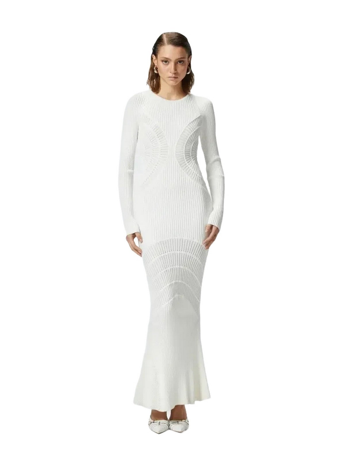 Long dress crafted from a technical viscose blend knit with a ribbed knit and a sunburst pattern on the sides and skirt, creating a distinctive design. The knit dress features a fitted silhouette, a round neckline, long sleeves, and a slightly flared skirt, creating a mermaid-like silhouette. This knit dress is a must-have for spring, elegant and incredibly versatile, perfect for customizing to suit the occasion and your personality.
