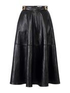 ELISABETTA FRANCHI skirt in crackled leather-effect synthetic material with a regular fit. Embellished with gold-tone metal logo accessories, it features a flared hem that adds a light, elegant touch.