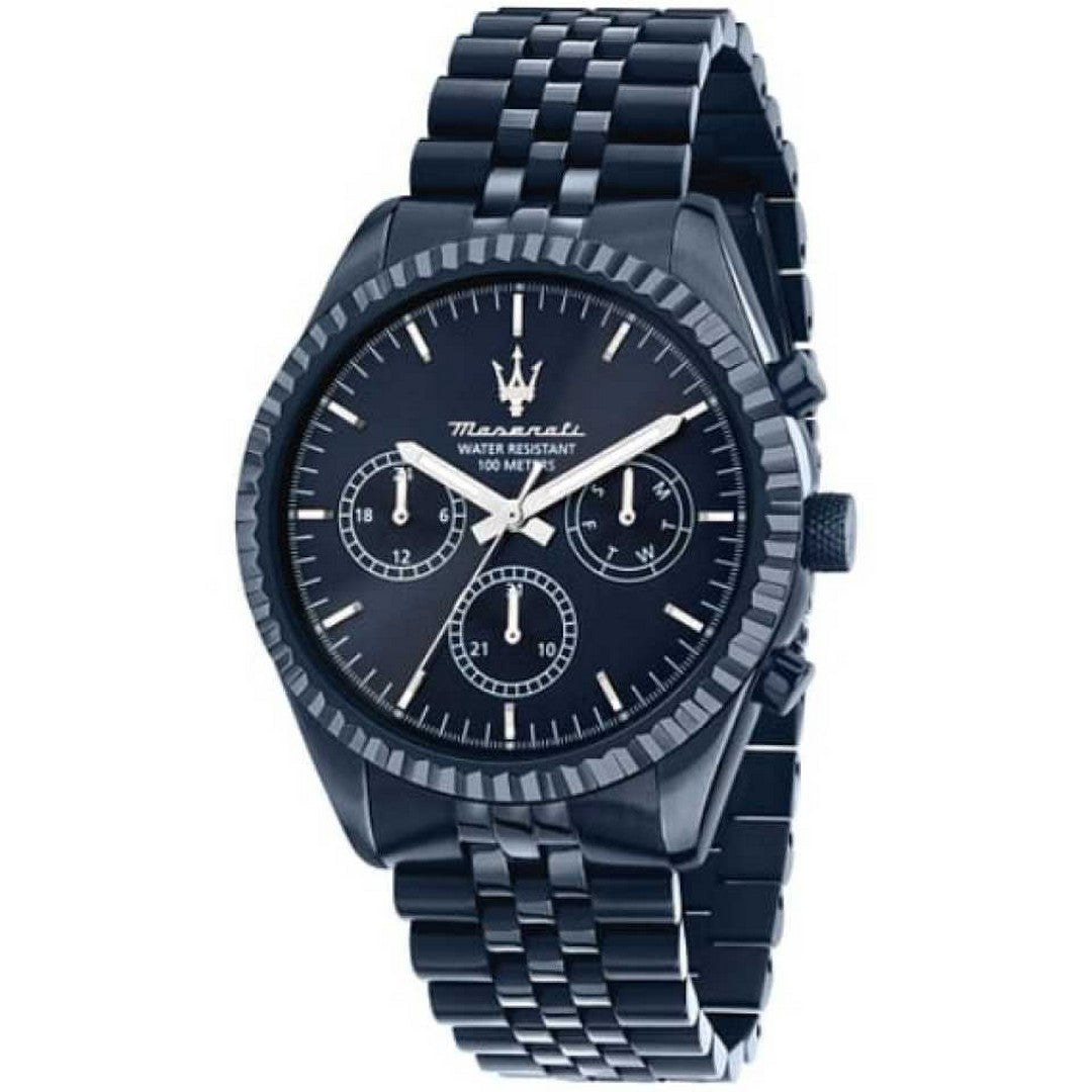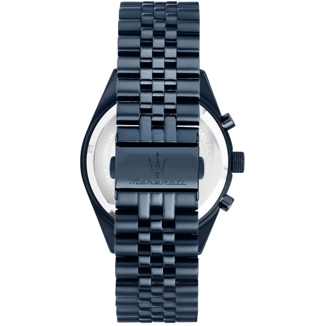 A bold timepiece with a 43.00mm diameter and 11.00mm thick blue steel case, finished with a captivating shine. The dial is protected by sturdy mineral crystal. The blue steel strap fastens securely with a diver's clasp featuring a safety lock. Powered by a precise quartz movement, this timepiece is water resistant to 10 ATM. It comes in its original Maserati packaging and benefits from an official 2-year warranty.