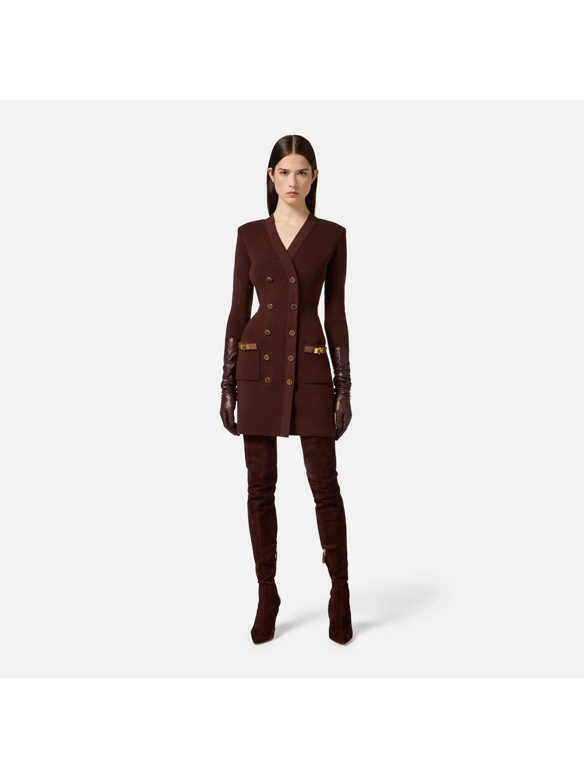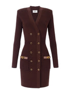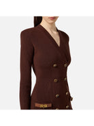 ELISABETTA FRANCHI fitted knit mini robemanteau dress. With a rich, enveloping texture, the dress features structured shoulders, a double-breasted jacket, and pockets embellished with decorative gold-tone metal turnbuckle straps. Amber-toned buttons complete the piece.