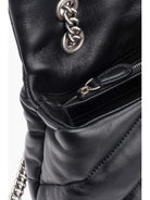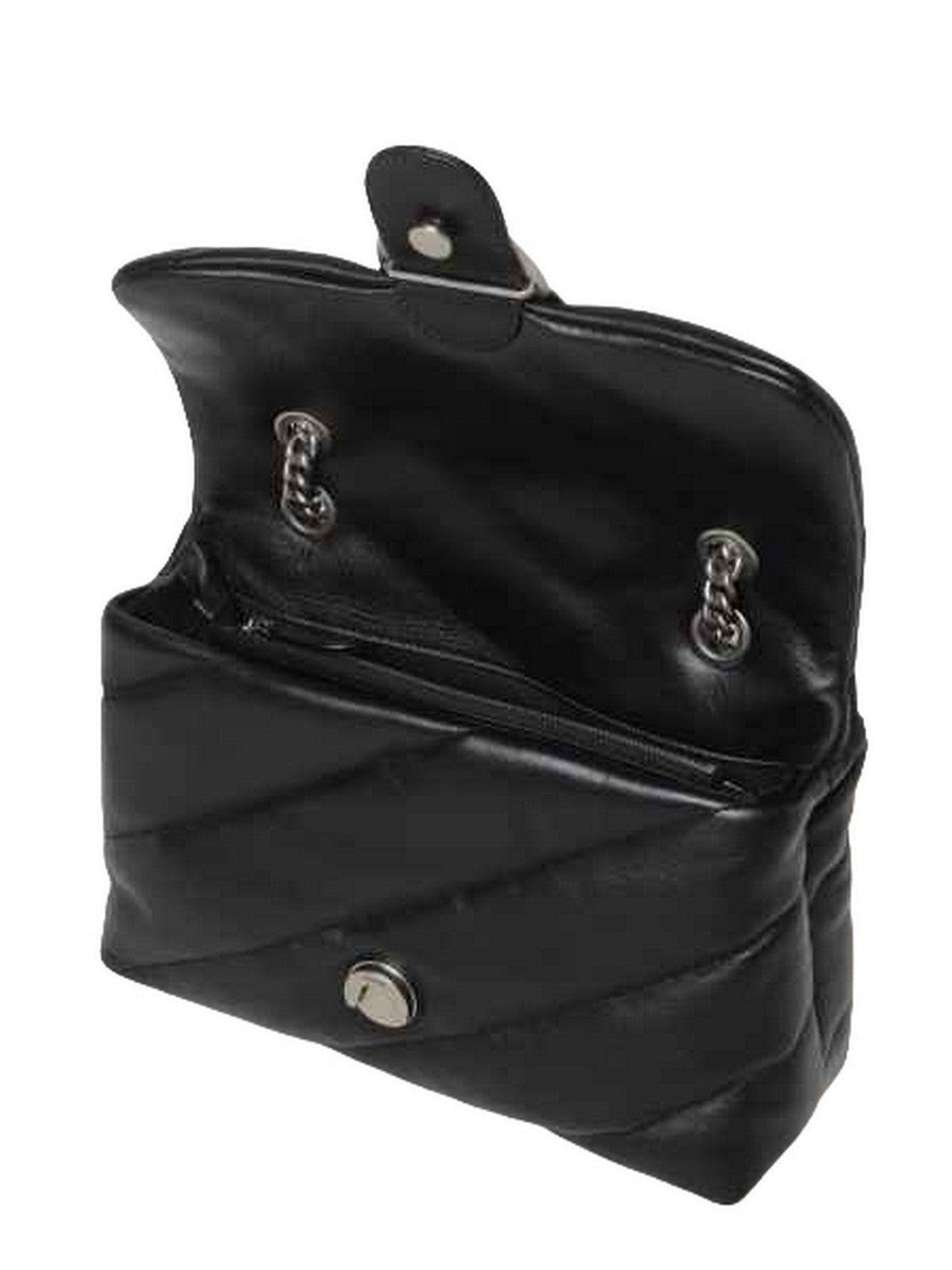 Classic Love Bag Puff in morbida nappa con maxi trapuntatura obliqua. La chiusura è completata dall'iconica fibbia in metallo Love Birds Diamond Cut. L'interno è foderato in microfibra scamosciata e comprende tramezza chiusa con zip e tasca a parete. La tracolla combina la classica catena metallica rotonda al pratico spallaccio in nappa.
