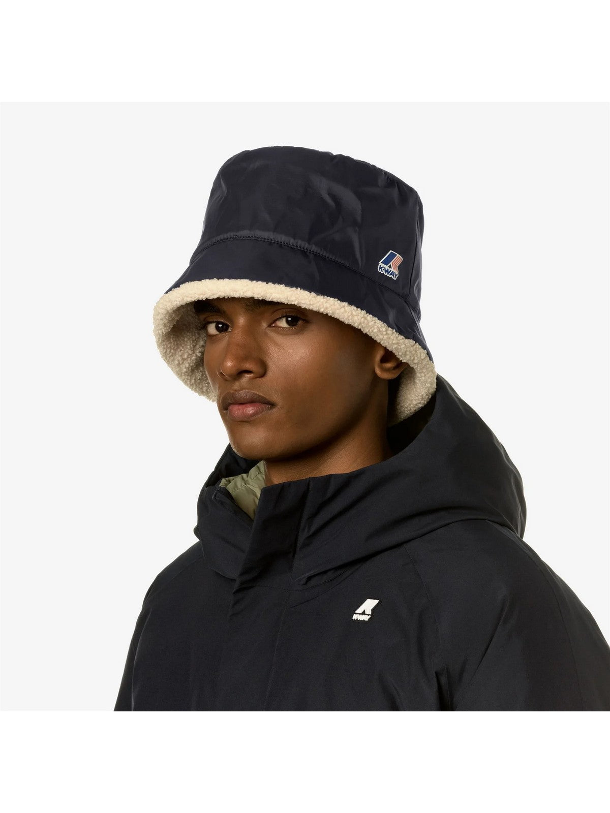 The K.WAY Pascalle hat is a short-brimmed hat with a classic bucket shape designed for winter. It's made of waterproof ripstop fabric with lightweight wadding padding and a sherpa lining that's warm and soft against the skin.
