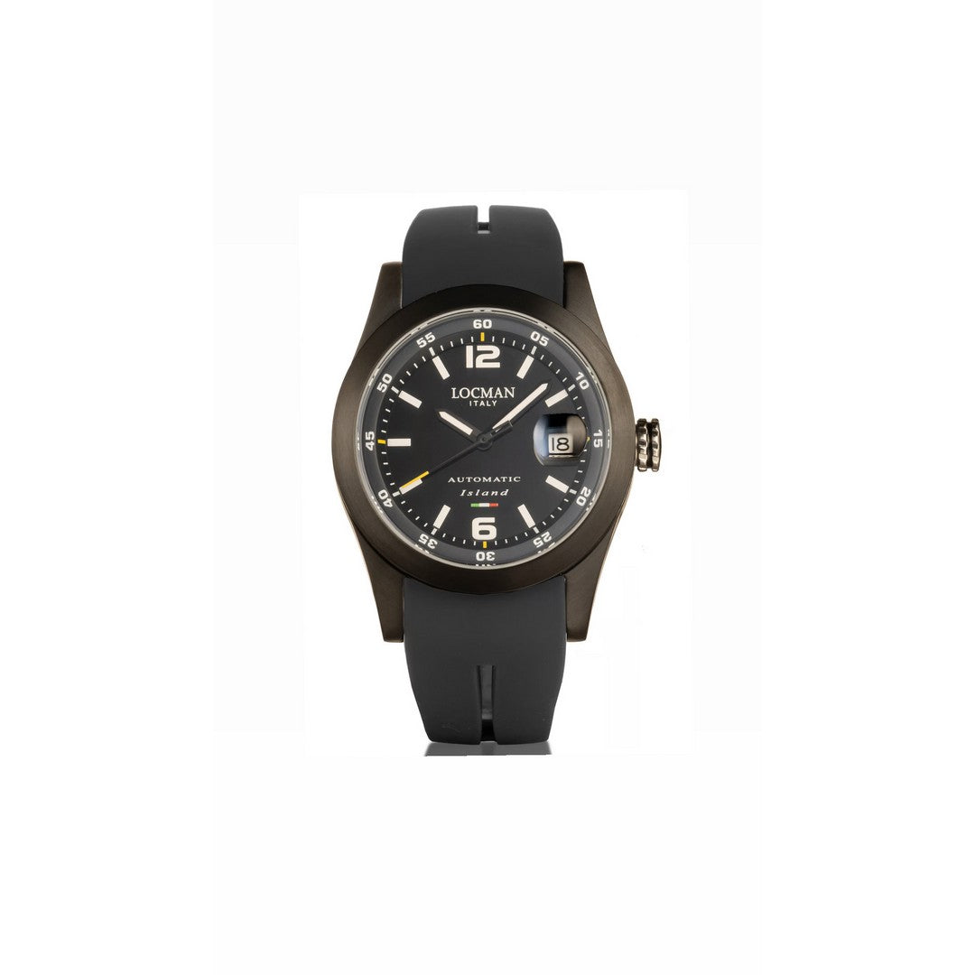 Locman men's automatic watch from the Island line with a new two-level black dial and seconds hand, 40mm black PVD-treated steel case and matching silicone strap, sapphire crystal, titanium caseback, water resistant to 5 bar. Time-only movement with date display. Ref. 0615K01S-BKBKWHSK