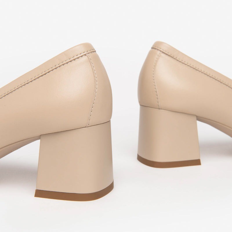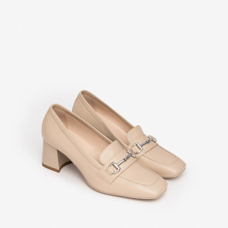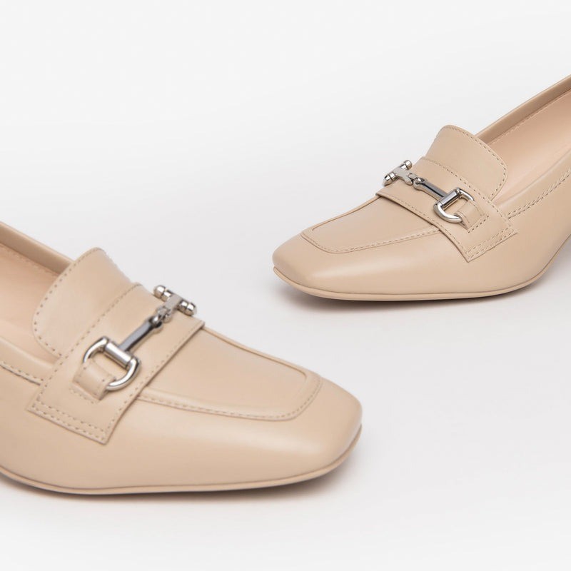 Elegance and practicality come together in this refined loafer. The E409471D model features a premium smooth leather upper available in rope, linen, beige, or white, embellished with a tone-on-tone metal clip. The 5.5 cm block heel ensures stability and comfort all day long, while the leather lining and insole offer excellent comfort. The non-slip rubber sole makes this model perfect for everyday wear. Made entirely in Italy, it features the Italian flag on the tread to underscore the quality of Italian craftsmanship.