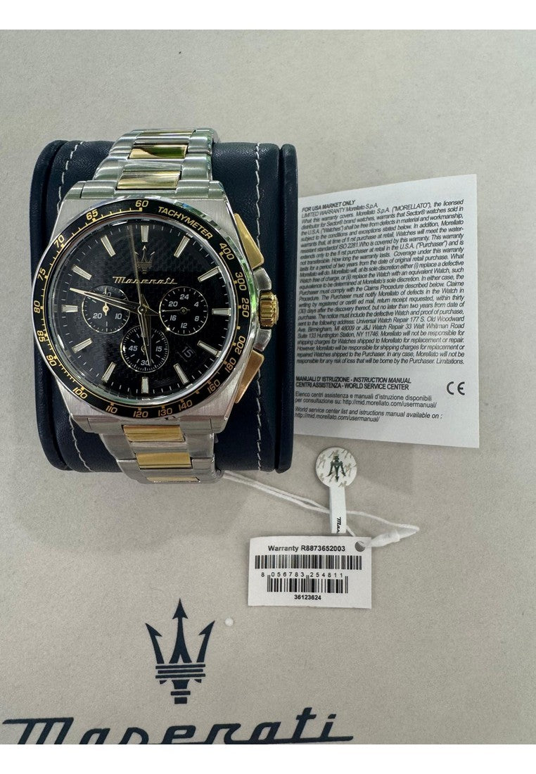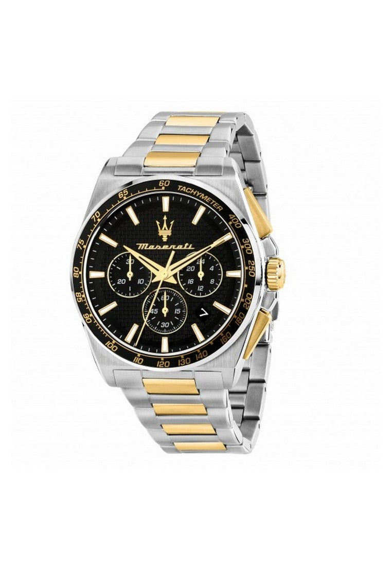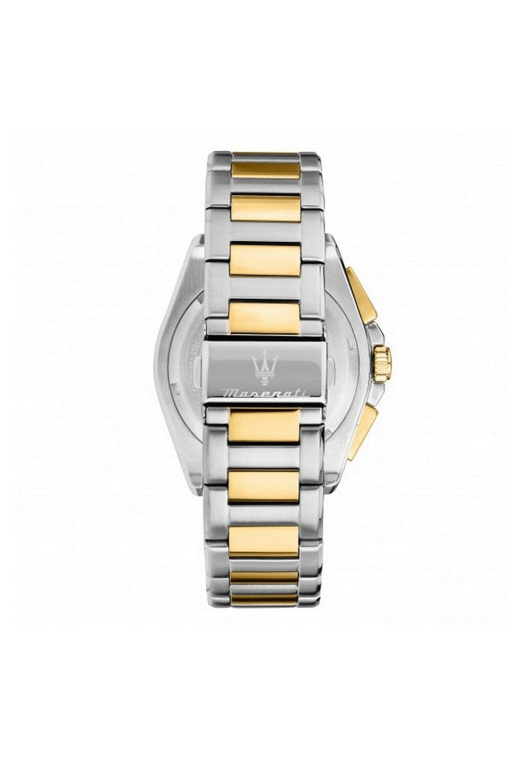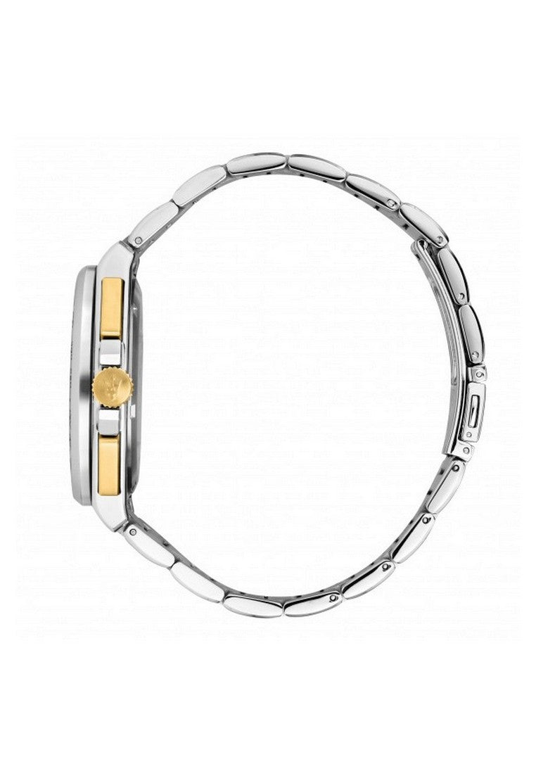Two-tone hypoallergenic steel strap in silver and gold; deployment clasp with push buttons.