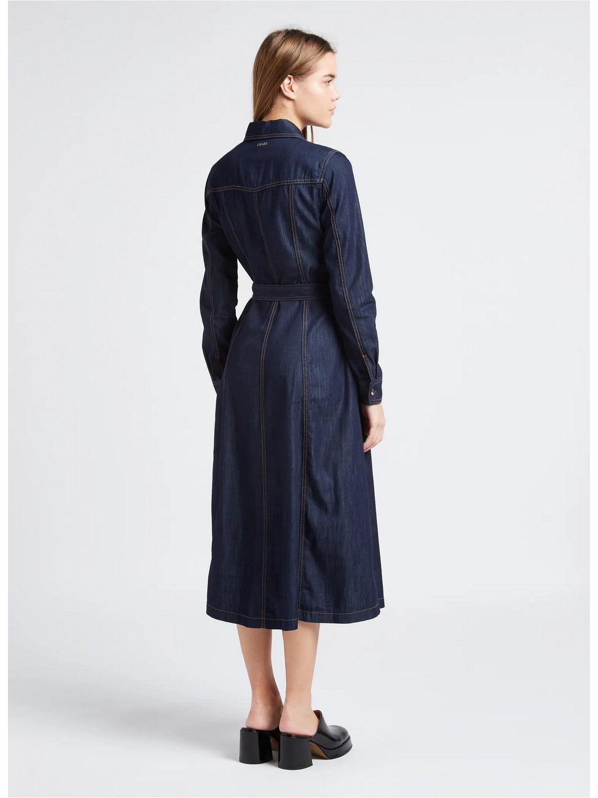 Robe chemise LIU JO en denim de coton. Lavage foncé. Col classique, manches longues avec poignets. Fermeture centrale avec boutons. Ceinture ton sur ton à la taille à nouer. Jupe longue évasée. Poches plaquées sur la poitrine avec rabat et bouton.