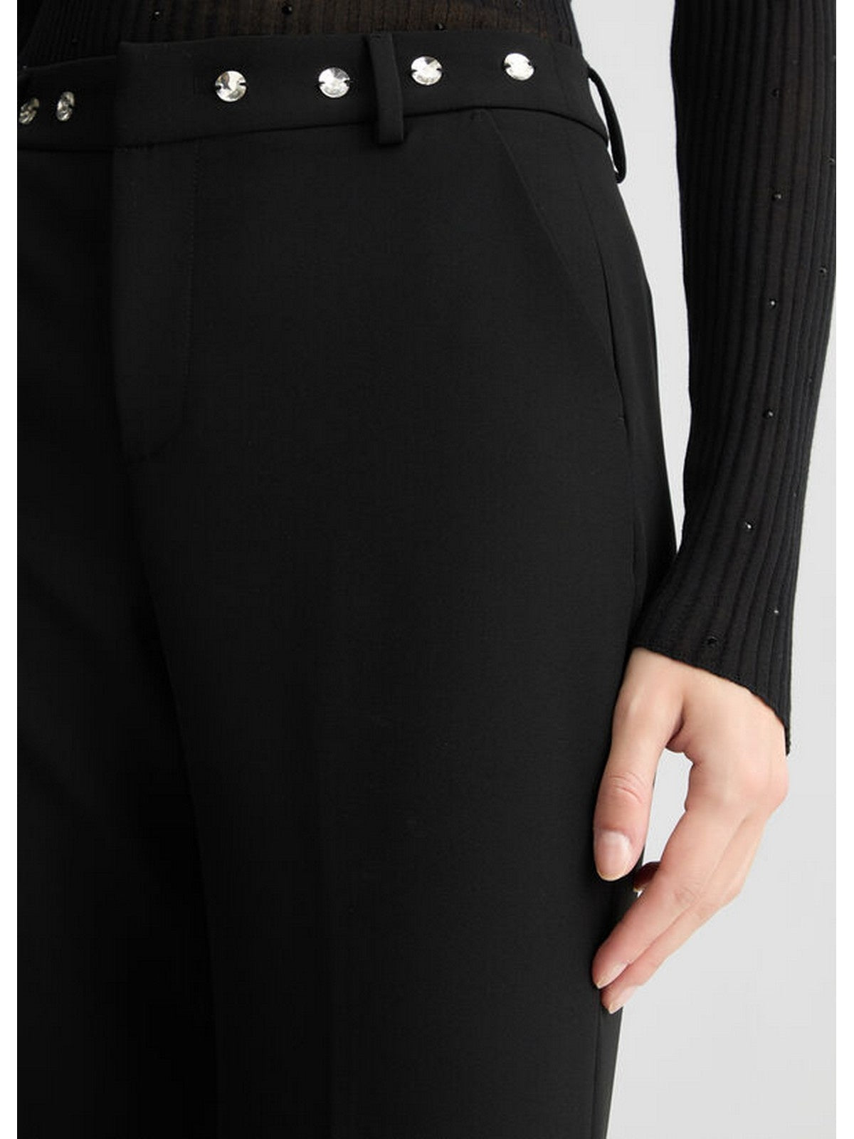 Esalta la tua eleganza con questi pantaloni neri d'ispirazione sartoriale, arricchiti da brillanti castoni gioiello sul davanti. Un perfetto mix di classe e dettagli luminosi che non passa inosservato.