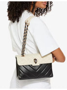 Borsa KURT GEIGER Kensington realizzata in pelle nera e osso con impunture che combinano motivi intrecciati e chevron. La testa d'aquila in smalto nero è posta sulla patta frontale.