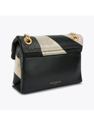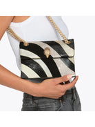 Borsa KURT GEIGER Mini Kensington realizzata in pelle bianca e nera con motivo a onde e dettagli impreziositi da cristalli. La testa d'aquila in oro spazzolato è posizionata sulla patta frontale.