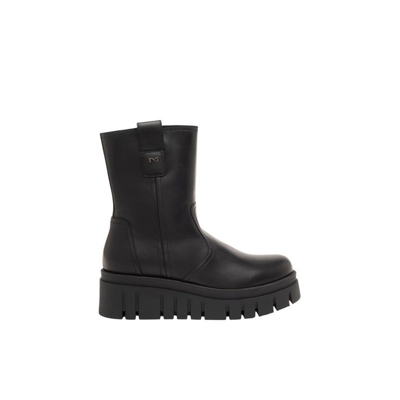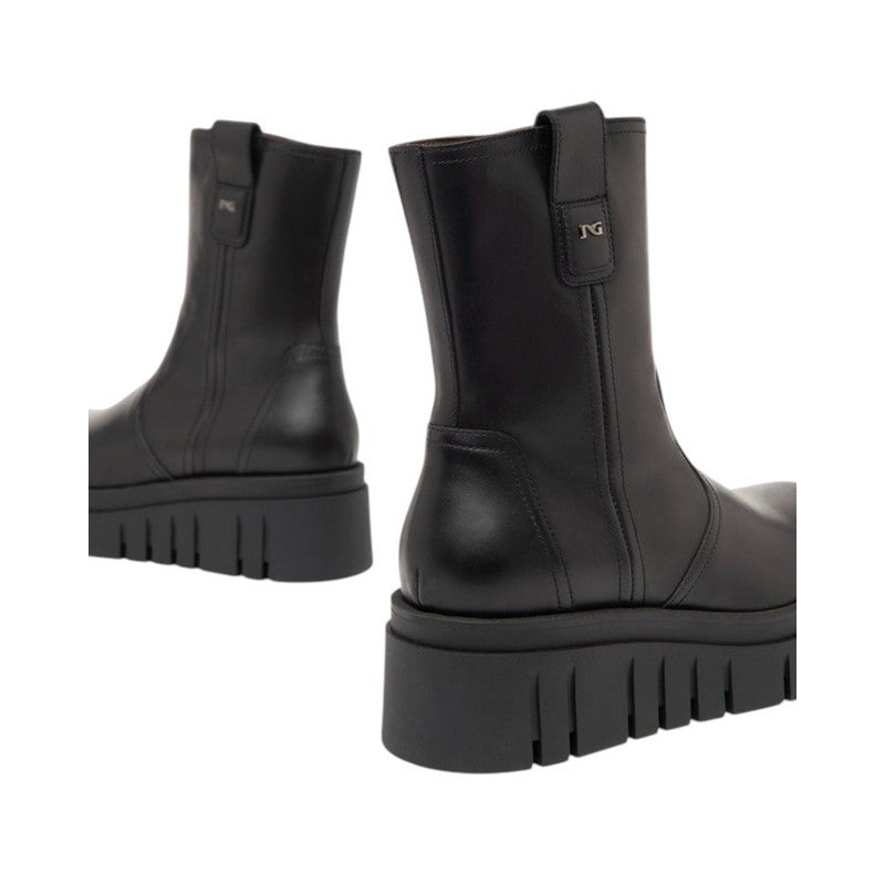 Realizzato in morbida pelle nera di alta qualità, questo stivaletto presenta linee pulite e una silhouette slanciata, impreziosita da una piccola etichetta con logo NG tono su tono applicata sulla linguetta posteriore.