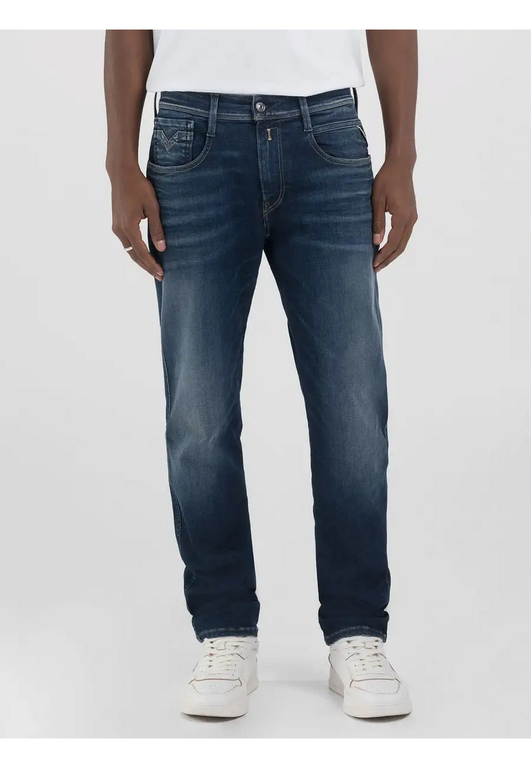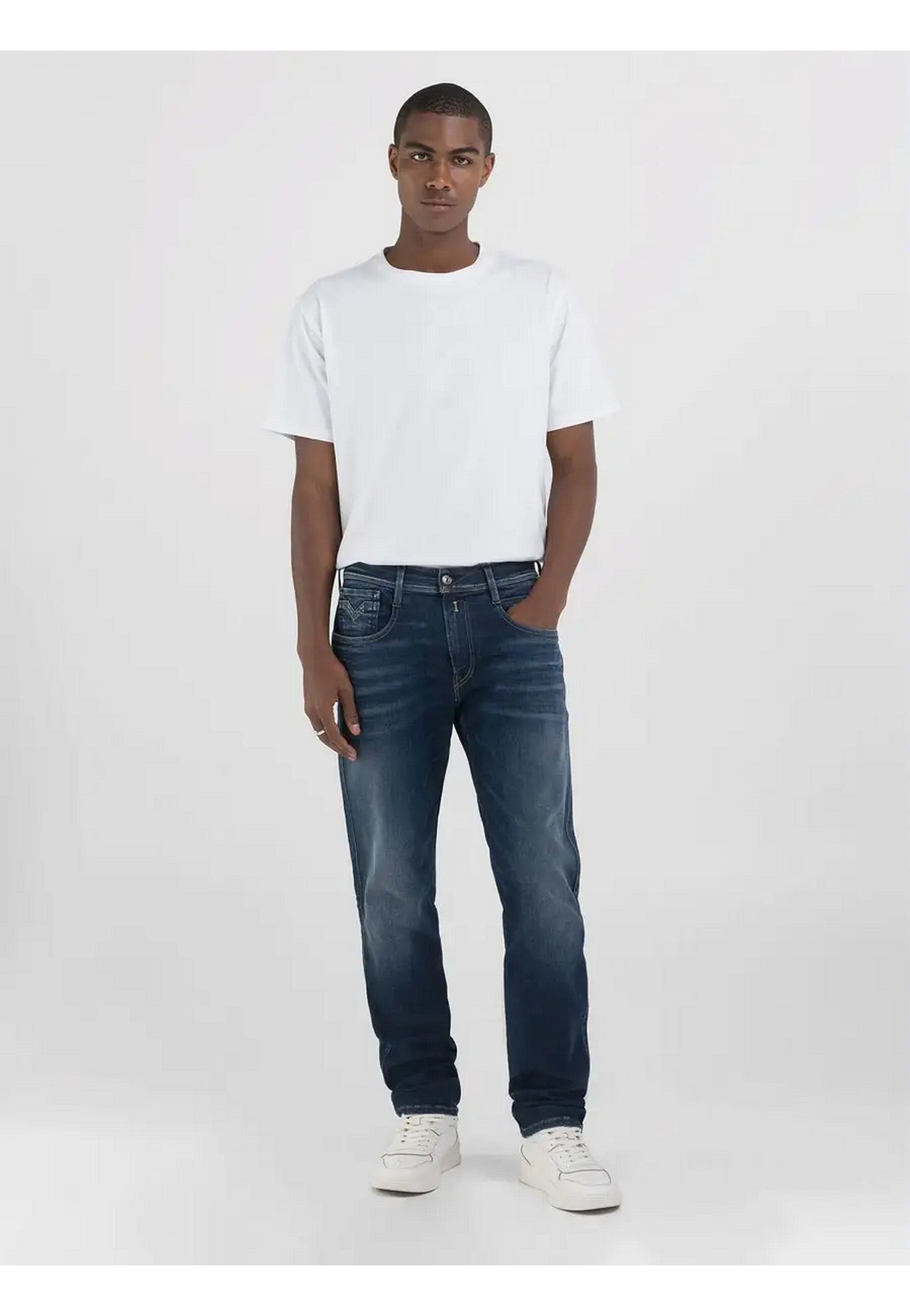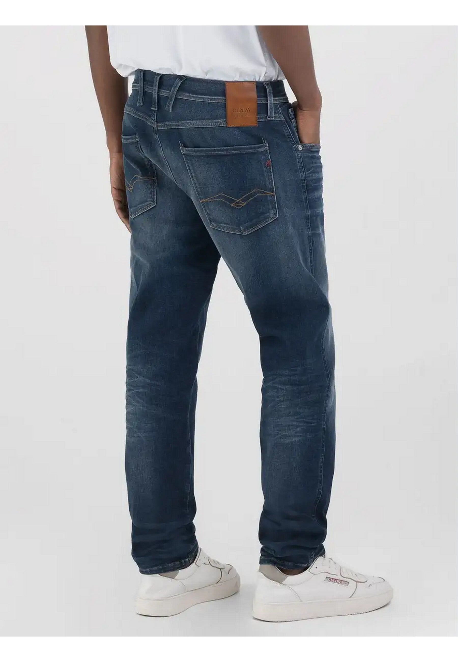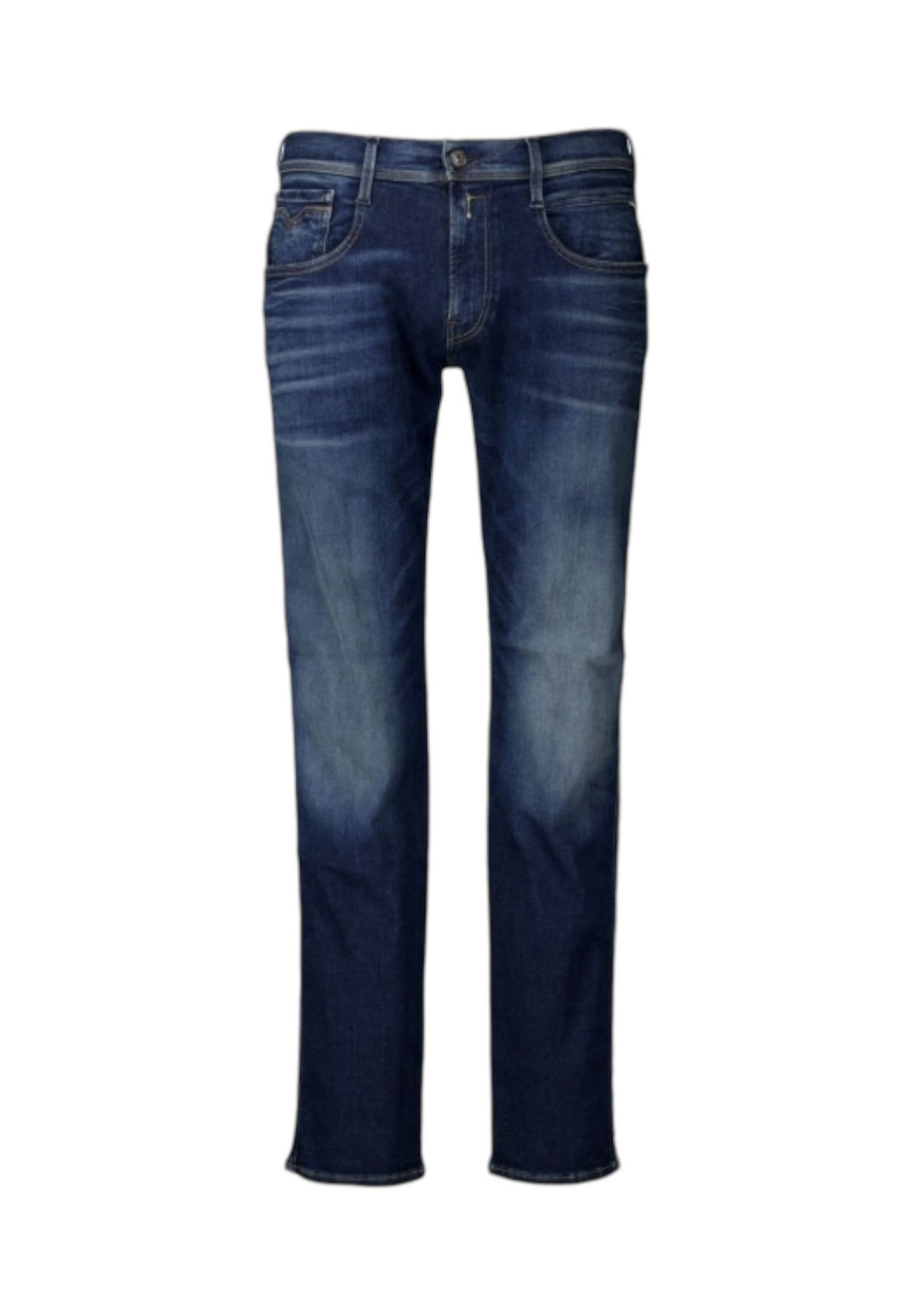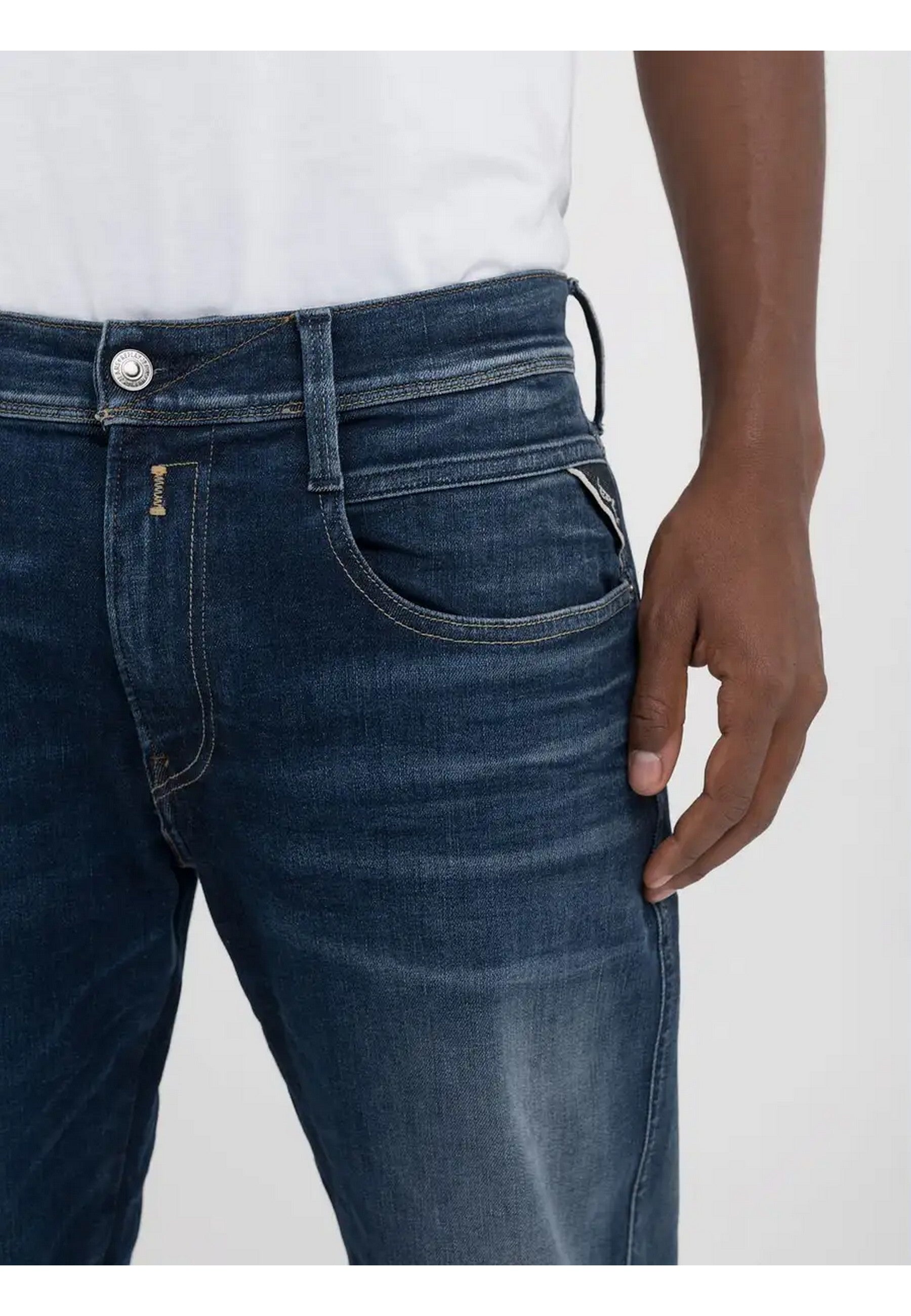 Jeans REPLAY realizzato in indigo profondo denim di misto cotone stretch, lavaggio scuroSlim fitVita regolareGamba morbida più affusolata verso il fondoCinque tasche con effetto di resinaturaChiusura con bottone e zip