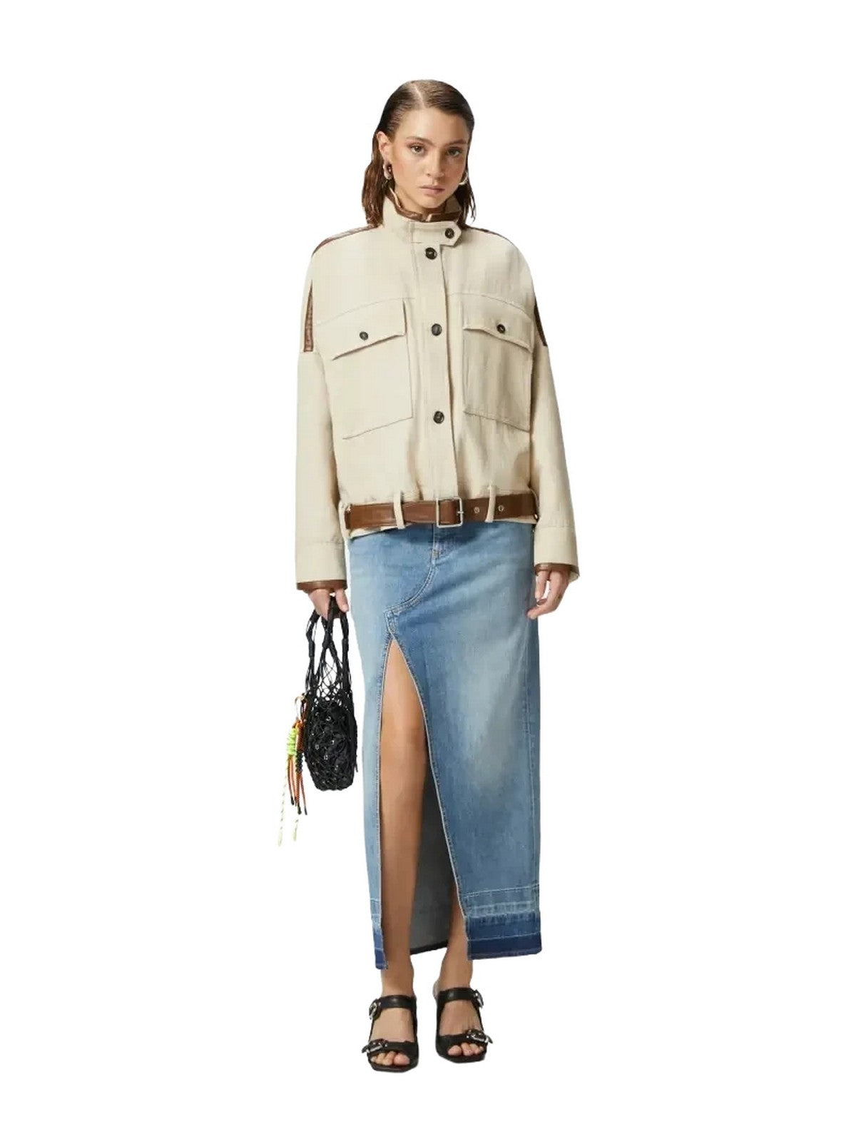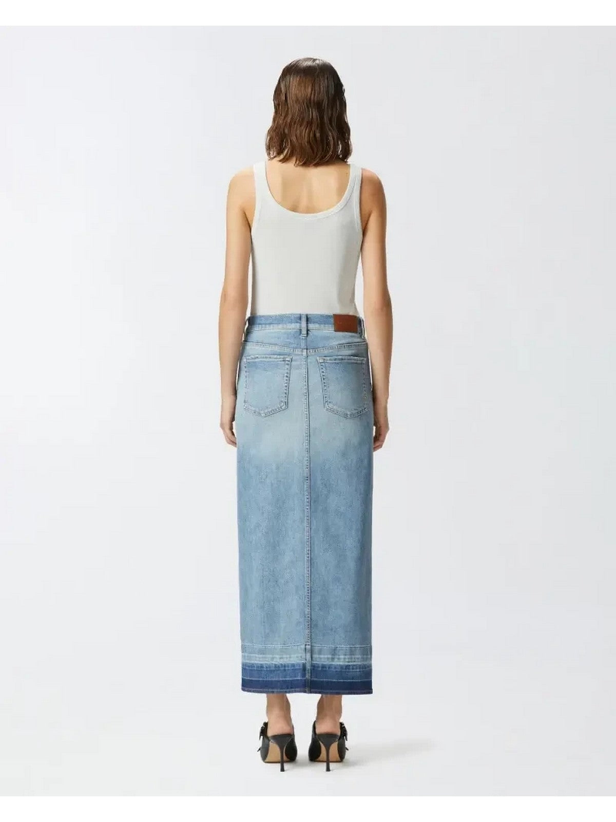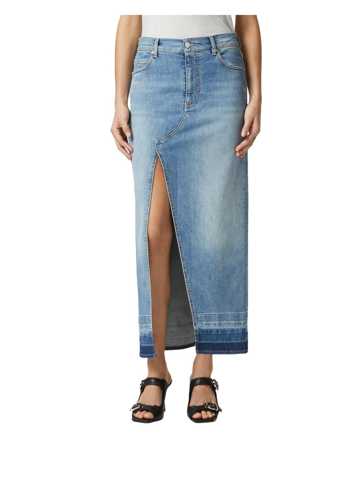 Gonna lunga dalla silhouette cinque tasche realizzata in denim di cotone stretch lavaggio easy rider, caratterizzato da un colore medio chiaro. La linea dritta, femminile e contemporanea, dalla gonna è personalizzata da profondo spacco davanti e fondo capo con trattamento a riserva che crea un effetto degradè con una tonalità più scura. La chiusura, con bottone in metallo e zip coperta, evoca il design classico dei jeans, rendendo la gonna un indispensabile per un outfit da giorno che combina femminilità e stile iconico.