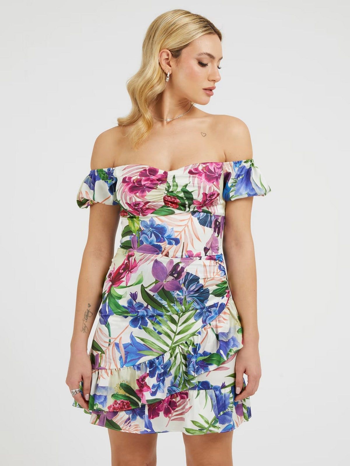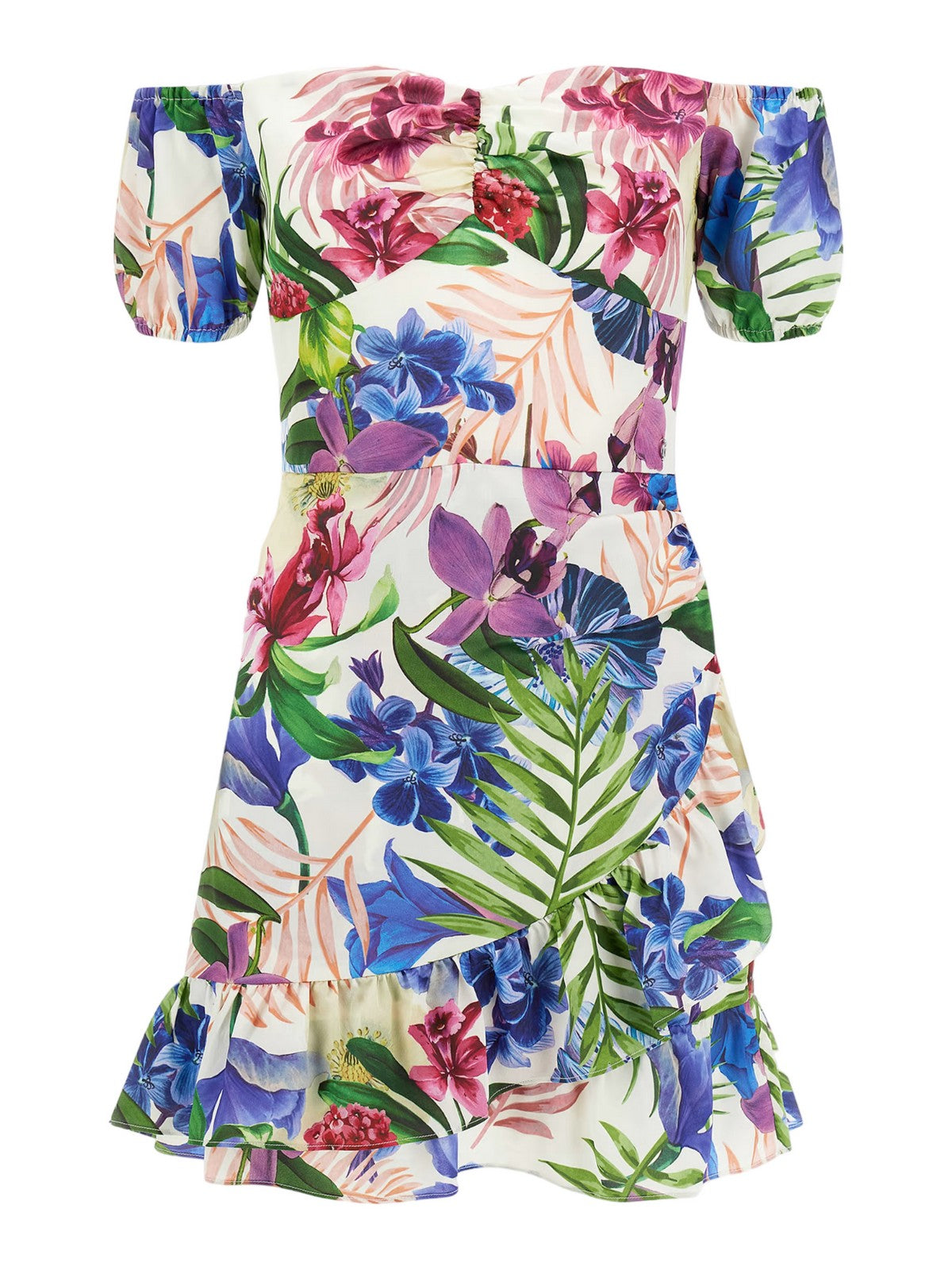 Abito GUESS in satin. Spalle scoperte. Maniche corte e spalline rimovibili.