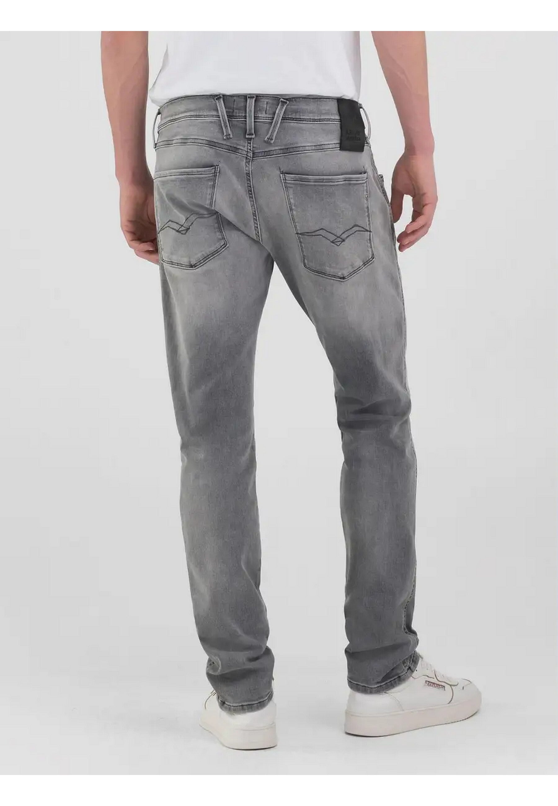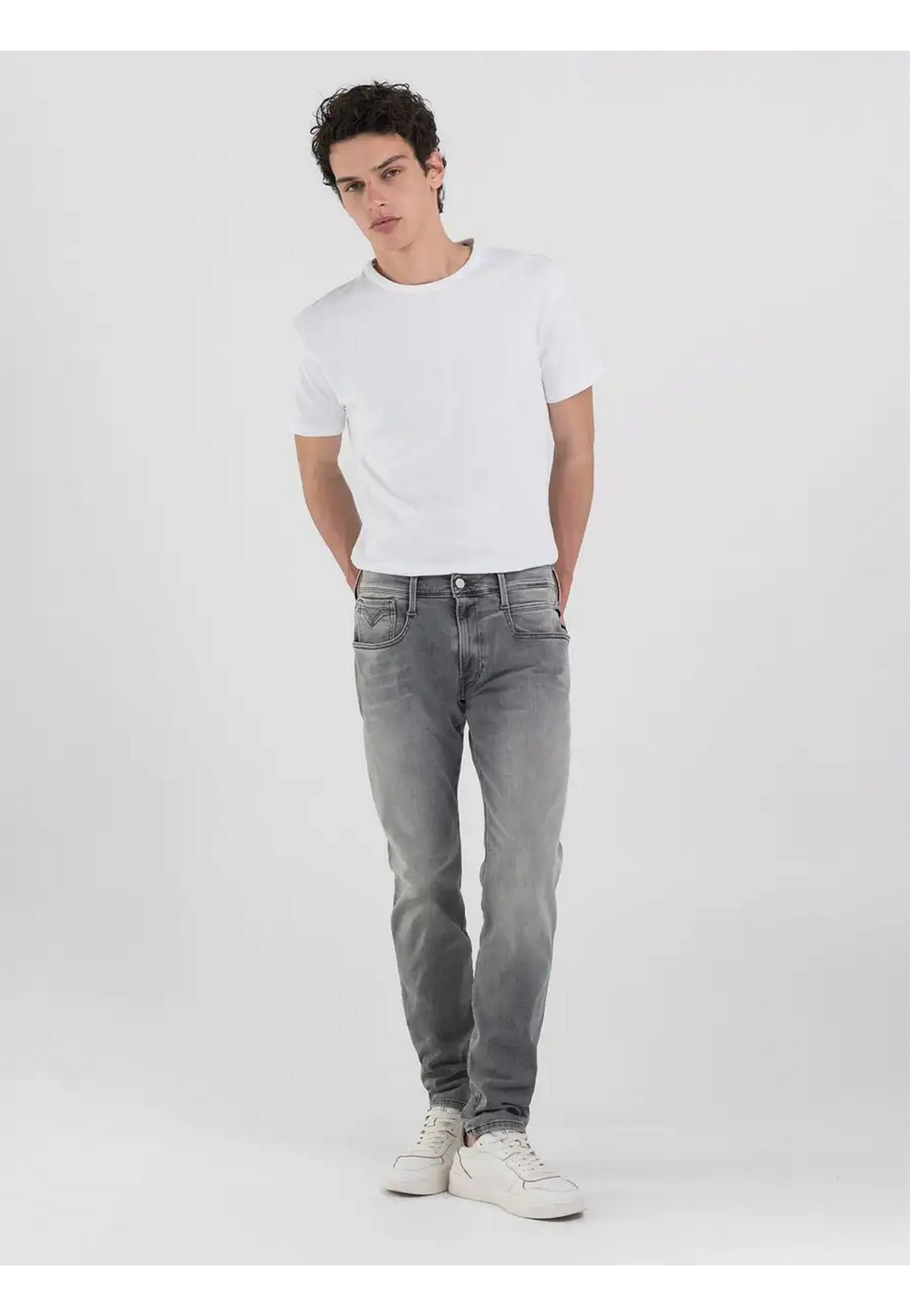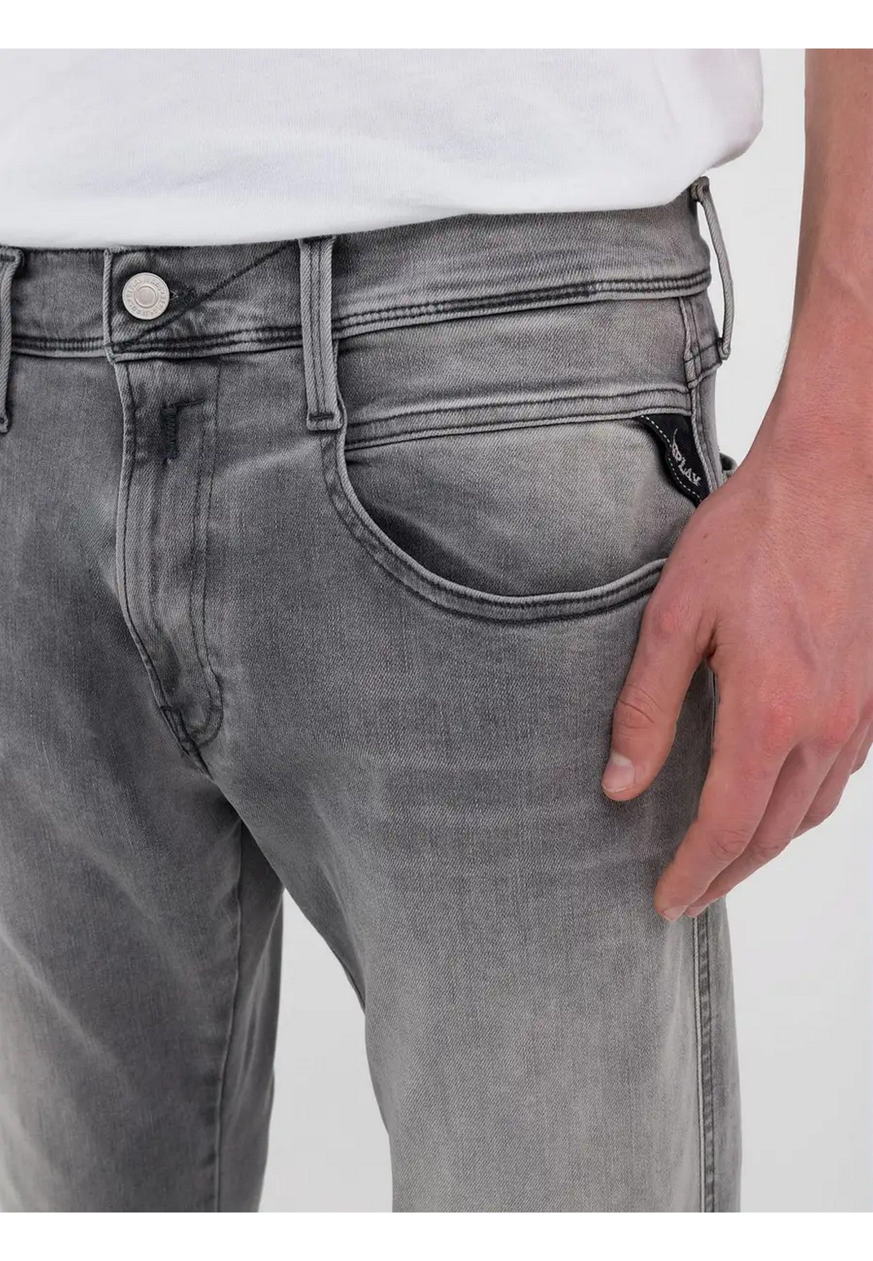 Jeans REPLAY realizzato in denim nero di misto cotone stretch, lavaggio grigioSlim fitVita regolareGamba morbida più affusolata verso il fondo Cinque tasche Micro abrasioni sulle zone d'usuraRicamo RChiusura con bottone e zip