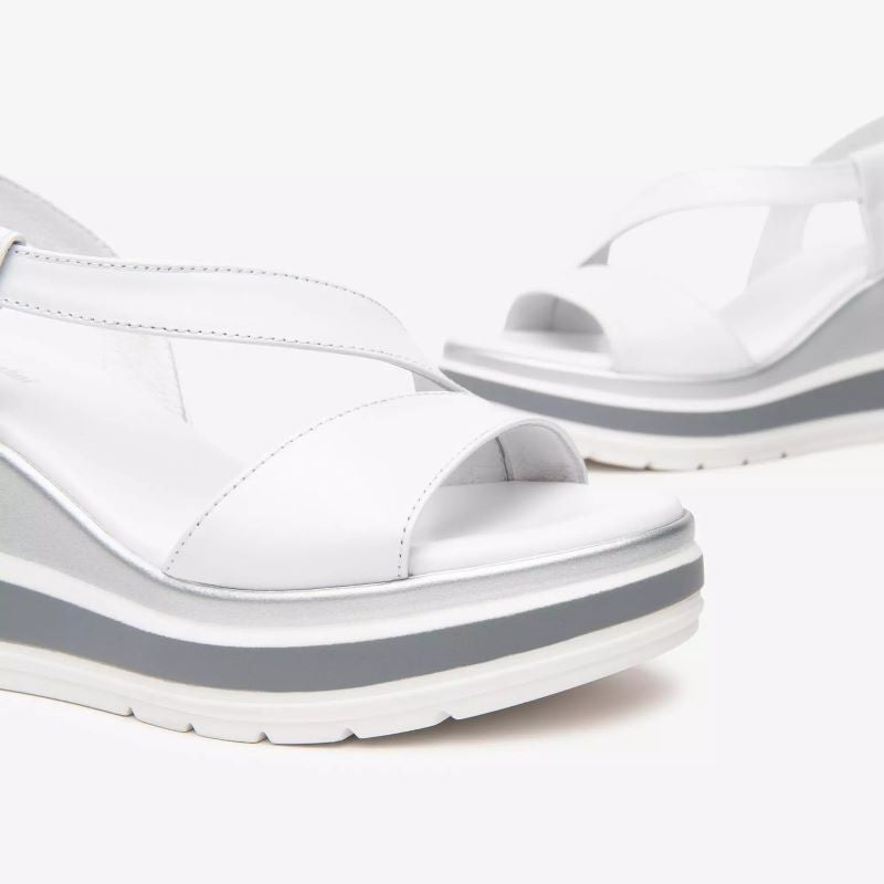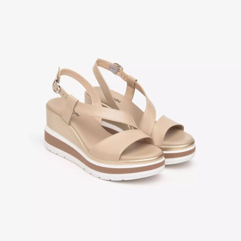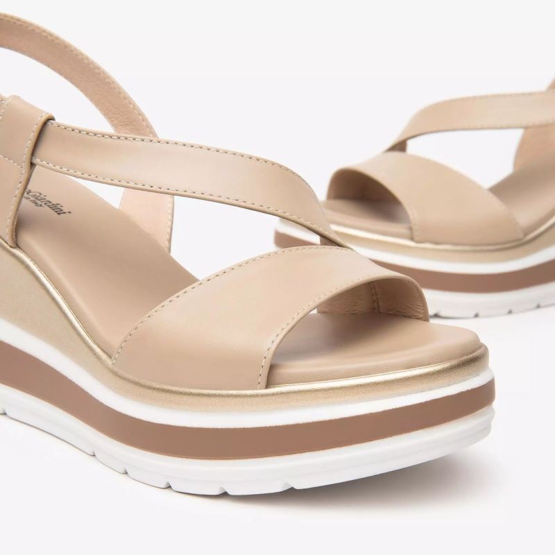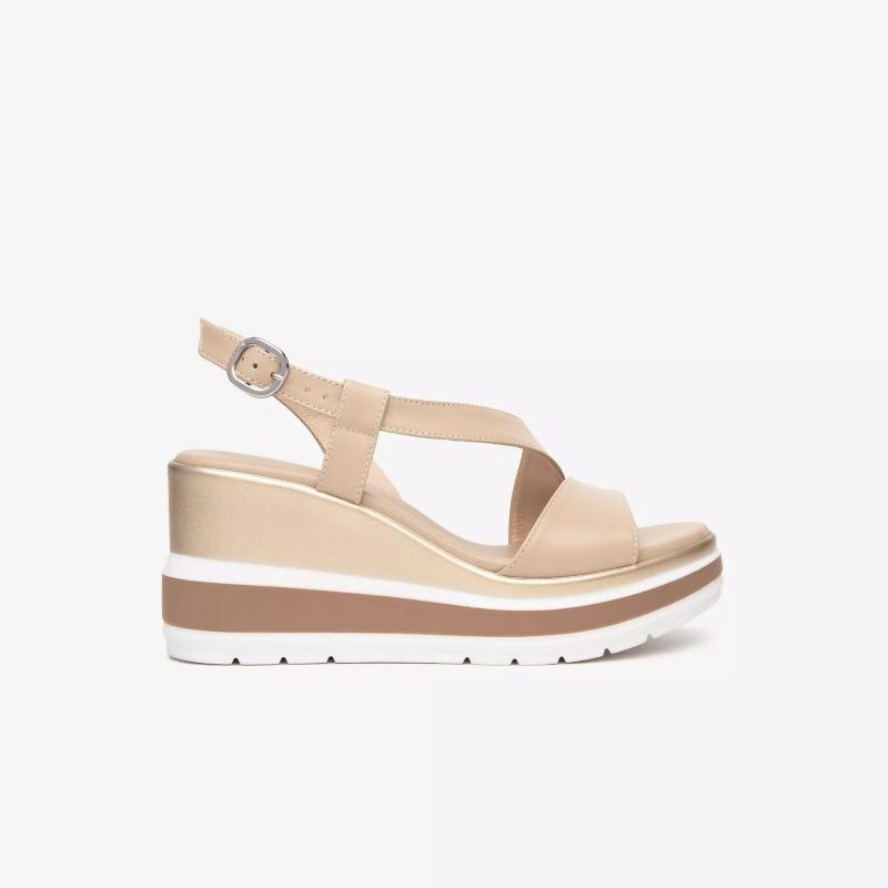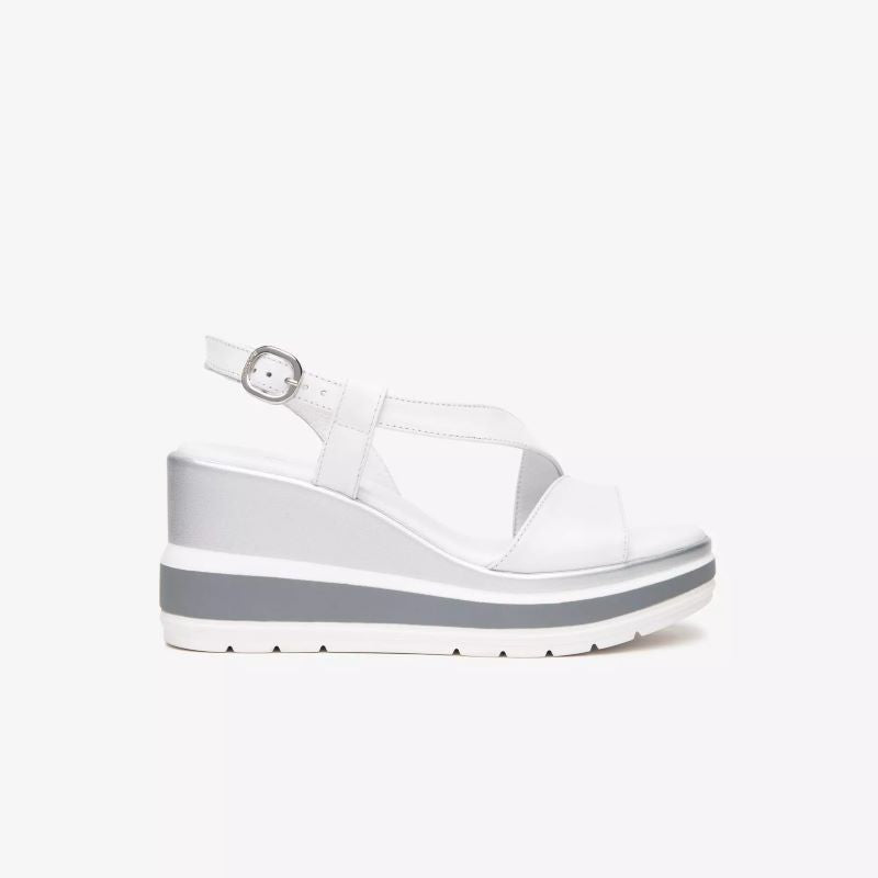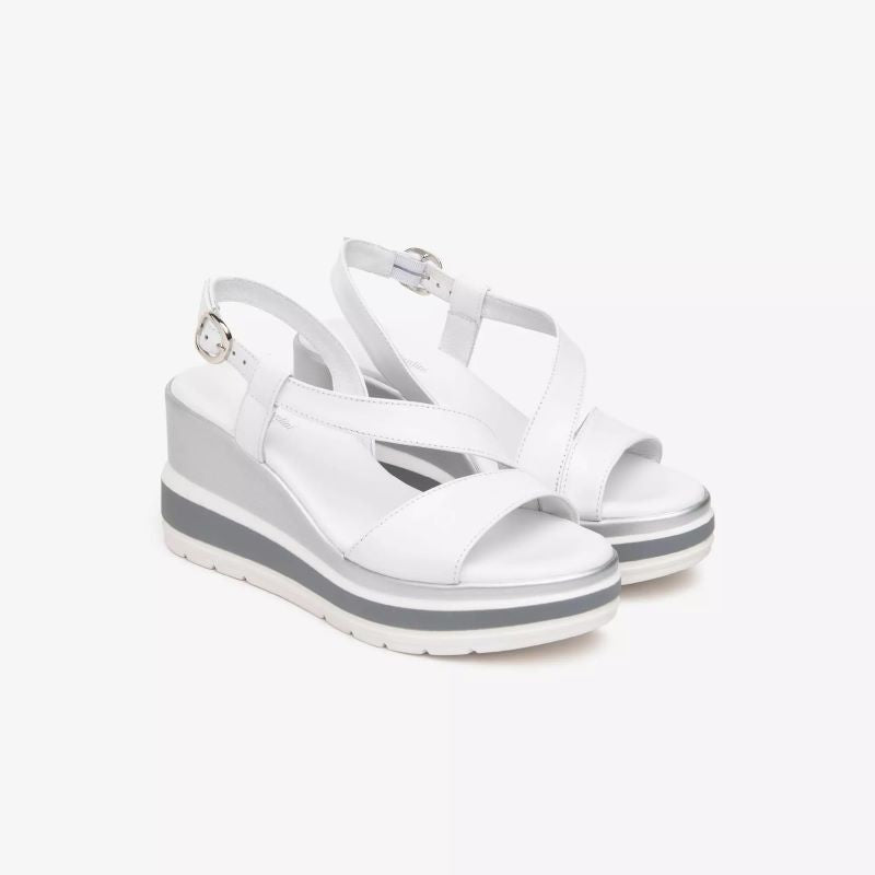 Sandalo da donna Nero Giardini, modello E513520D, con zeppa media di circa 7?8 cm. Realizzato in pelle italiana pregiata, disponibile in colori naturali come lino e bianco.Dotato di fasce frontali intrecciate e cinturino alla caviglia con fibbia, offre una calzata sicura e personalizzabile. Interno in pelle traspirante e suola in gomma antiscivolo per sole passeggiate con stile e comfort. Zeppa bilanciata che slancia la figura senza affaticare, ideale per look estivi, vacanze o outfit quotidiani.