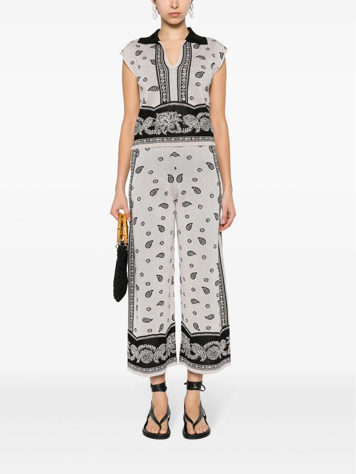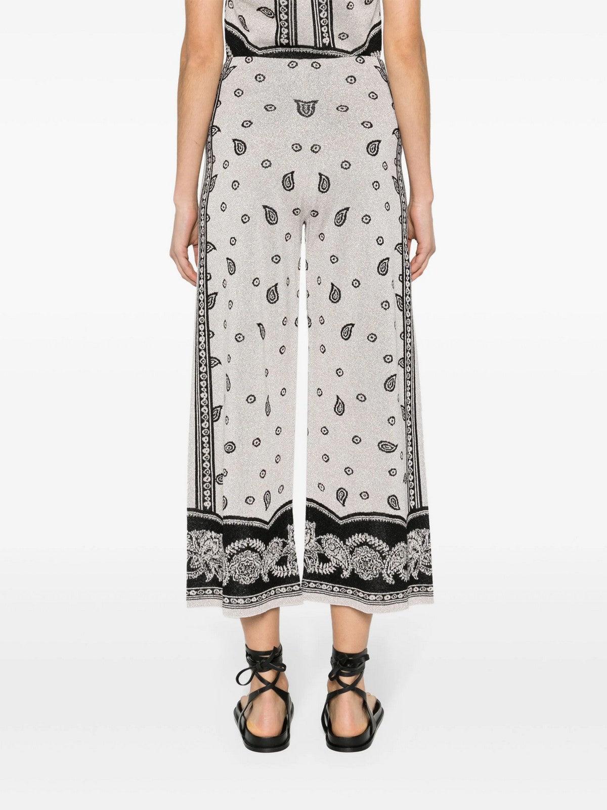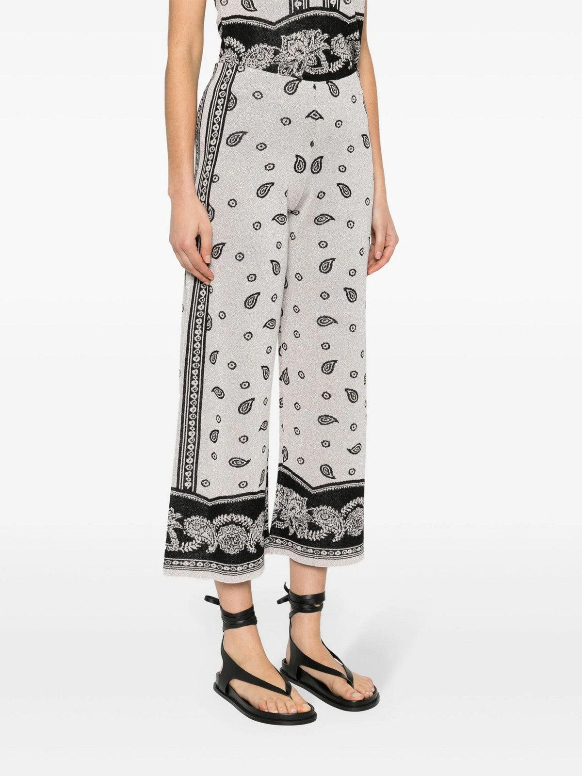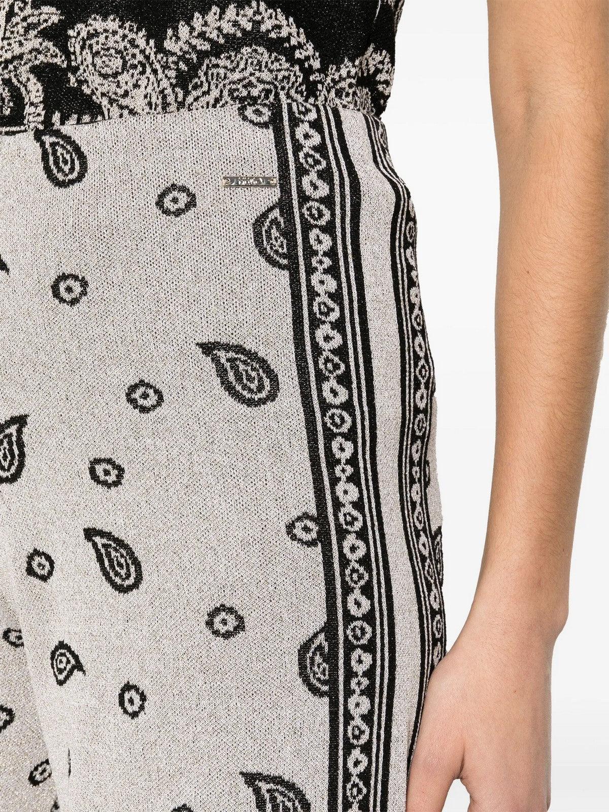 Spodnie LIU JO z mieszanki wiskozowej, z tkaniny żakardowej. Motyw bandany. Wysoka talia z gumką. Nogawka miękka, długość do kostki.