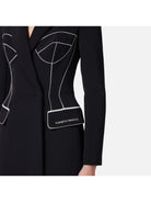 ? contrasting piping details recreate a bustier with a trompe-l'oeil effect