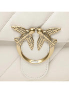 PINKO Big Love Bag Torba puchowa z miękkiej nappy z maksymalnie ukośnym pikowaniem. Zamknięcie klapy uzupełnia kultowa metalowa klamra Love Birds Diamond Cut. Wnętrze wyłożone jest zamszową mikrofibrą i zawiera przegrodę zapinaną na zamek oraz kieszeń ścienną. Pasek na ramię łączy klasyczny okrągły metalowy łańcuszek z praktycznym paskiem na ramię nappa.