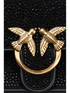 Mini Love Bag One PINKO z miękkiego zamszu ozdobionego małymi kryształkami. Zapięcie uzupełnia kultowa metalowa klamra Love Birds Diamond Cut, pokryta antycznym złotem. Wnętrze wyłożone jest zamszową mikrofibrą i zawiera przegrodę zapinaną na zamek oraz kieszeń ścienną. Pasek na ramię łączy klasyczny okrągły łańcuszek z praktycznym regulowanym skórzanym paskiem na ramię.