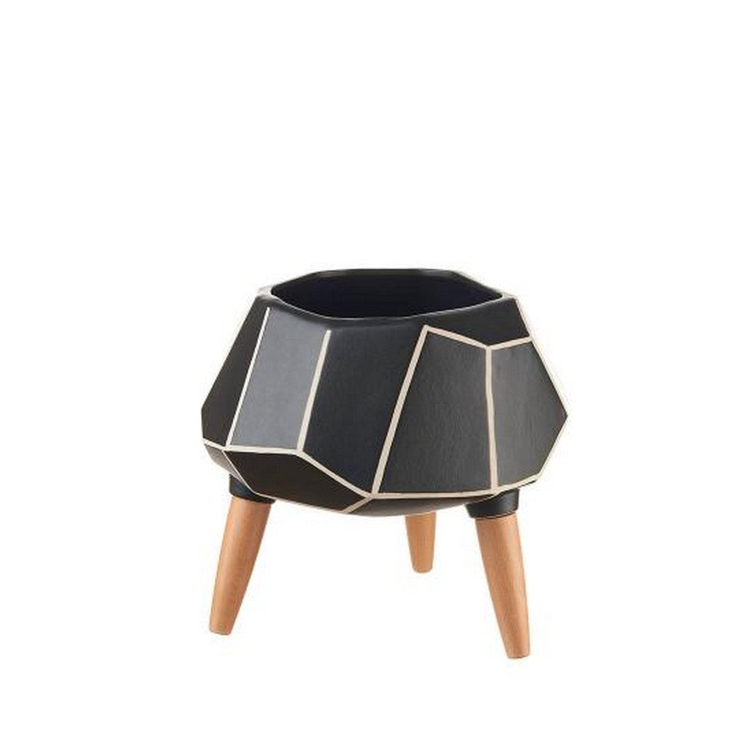 Low ceramic cache-pot with wooden feet. Indoor vase, with a geometric shape, inspired by diamonds. Contrasting colors, furnishes every room with modern elegance. To be combined with the tall version inspired by Urban for a minimal style decor.