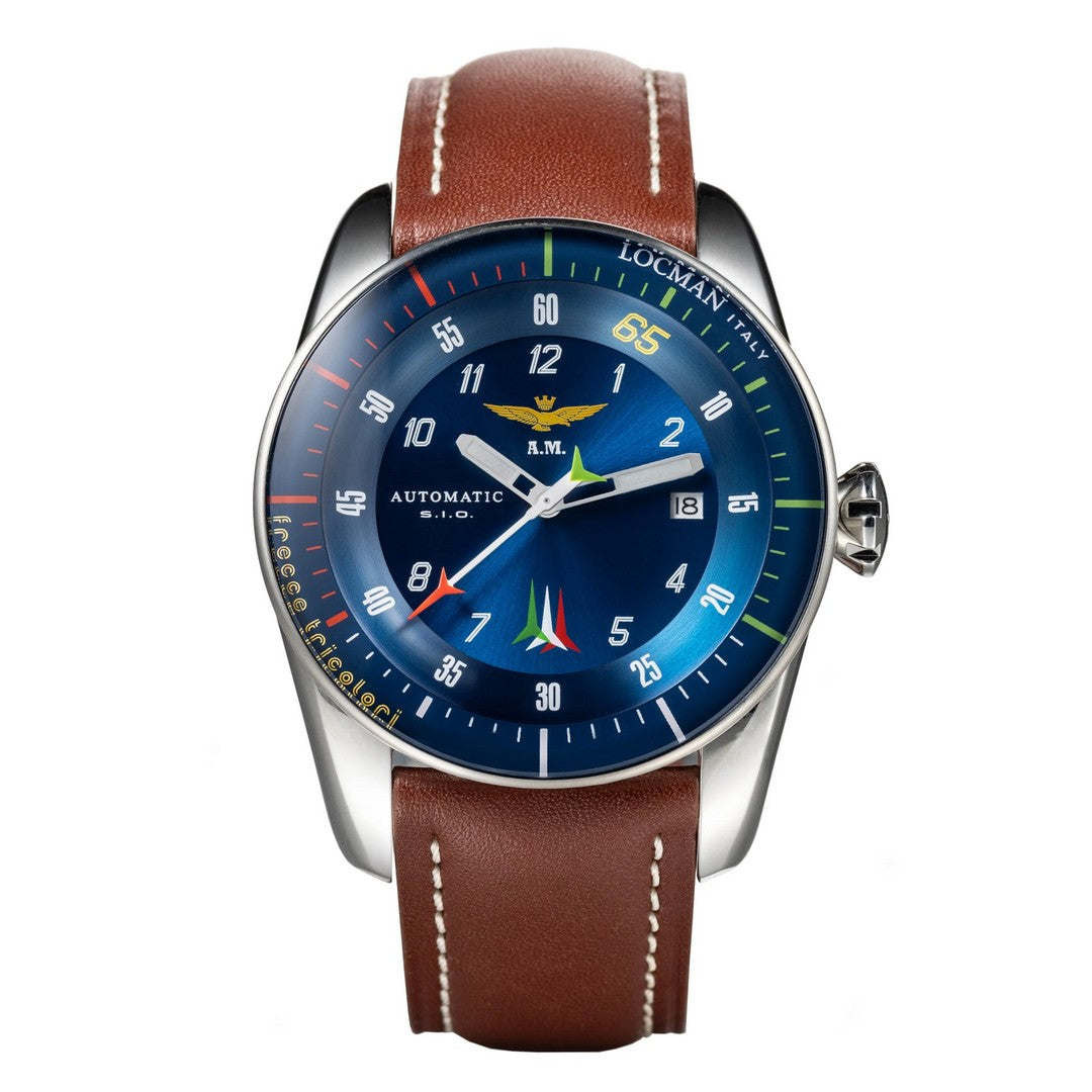 Orologio Locman realizzato in collaborazione con le pattuglia acrobatica Frecce Tricolori in edizione limitata a 650 pz numerati. Versione quadrante blu soleil, cassa in acciaio da 44mm e cinturino pelle marrone. Il movimento automatico visibile dal fondello è modificato dal SIO, Scuola Italiana Orologeria Cod. 0455A02S-00FTBLPT Il quadrante presenta tutti i simboli delle Frecce Tricolori, dalla strumentazione di bordo degli aerei di quegli anni, alla lancetta dei secondi a forma di freccia Tricolore, il numero 65, a celebrare la 65sima stagione acrobatica. Al 12 campeggia l'Aquila Turrita, simbolo di tutti i piloti dell'Aeronautica Militare, e al 6 troviamo il logo della Pattuglia con le Tre Frecce. La cassa è resistente fino a 100mt ed è impreziosita da un vetro zaffiro mentre il fondello riporta la numerazione della serie limitata e l'oblò, in vetro minerale, ha serigrafato il famoso logo delle Frecce Tricolori. Cinturino in pelle marrone con impunture a contrasto e chiusura a fibbia.