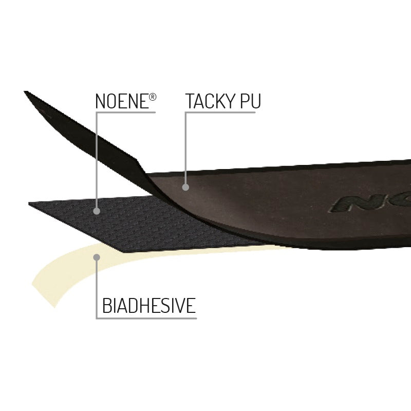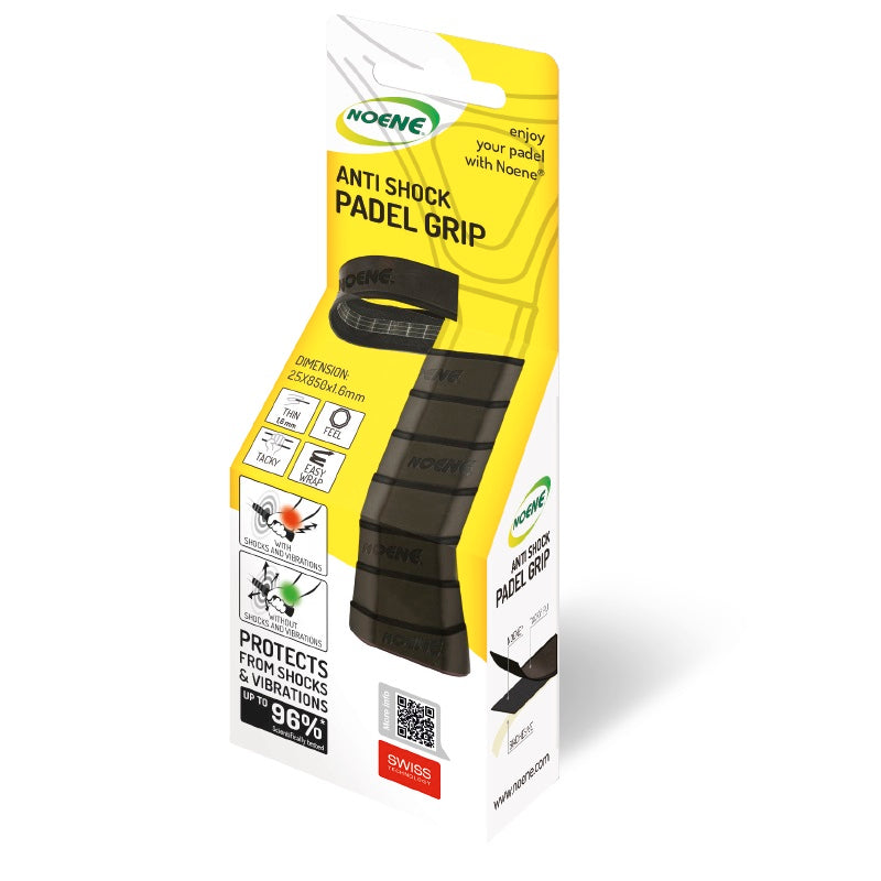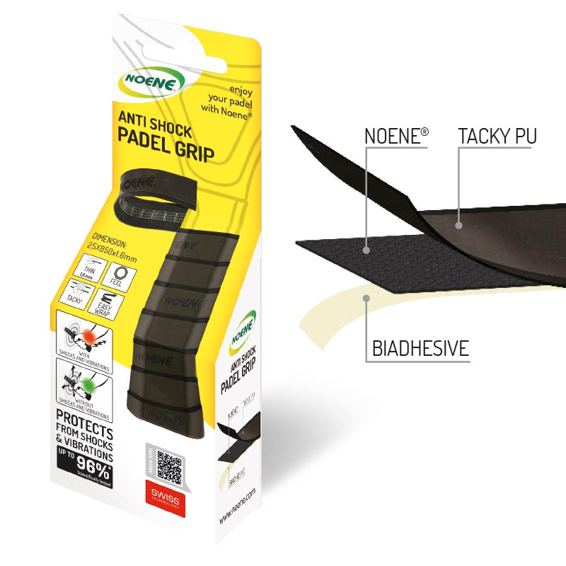 Noene anti-shock and anti-vibration Padel Grip. Noene grip designed specifically for Padel players, protects hands and shoulders from shocks and vibrations up to 96% caused by the impact of the ball with the racket, thanks to the Noene material. With 1.6 mm thickness and the TACKY PU coating, it does not alter the feel of the racket grip and guarantees optimal grip. It is easy to install thanks to the double-sided, durable, stick-and-peel adhesive. Single blister pack Dimensions 25x850x1.6 mm Salbini articoli tecnici per lo sport is an official Noene dealer.