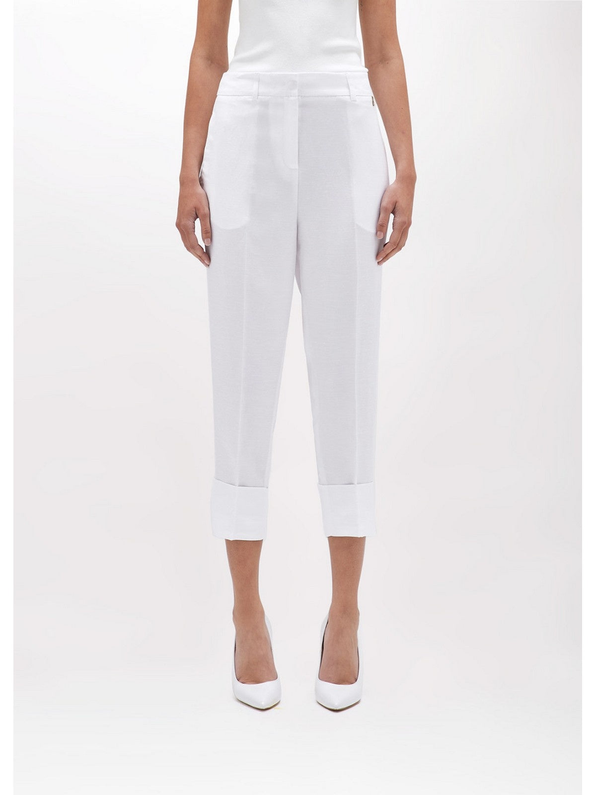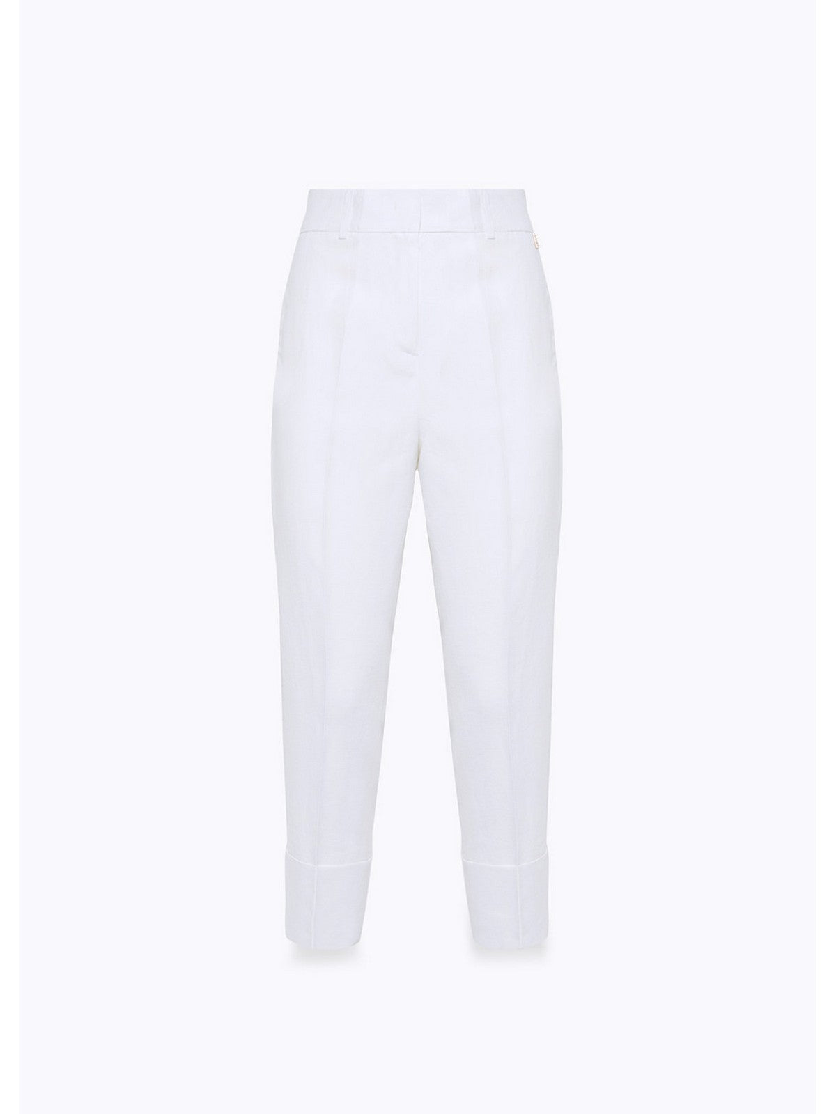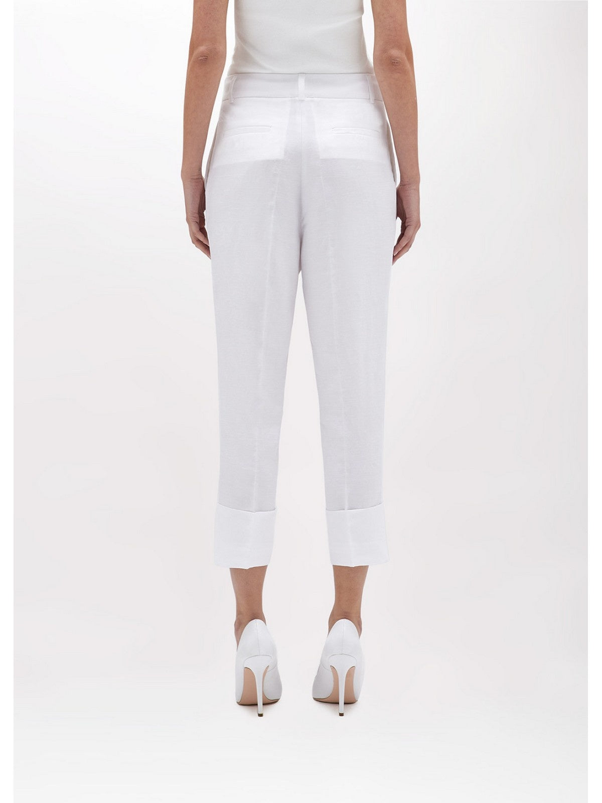 CIGARETTE FIT TO MAKE YOU FEEL COMFORTABLE AND CHIC ON ANY OCCASION: TROUSERS IN ENVERS SATIN LINEN BLEND WITH WAISTBAND LOOPS, ZIP AND BUTTON CLOSURE, FRENCH POCKETS, BACK PIPING, SEWN CUFF AT THE BOTTOM, IRONED PLEAT. CREATE THE PERFECT SUIT WITH YOUR FAVORITE MATCHING JACKET. COMPOSITION: 77% VISCOSE 23% LINEN