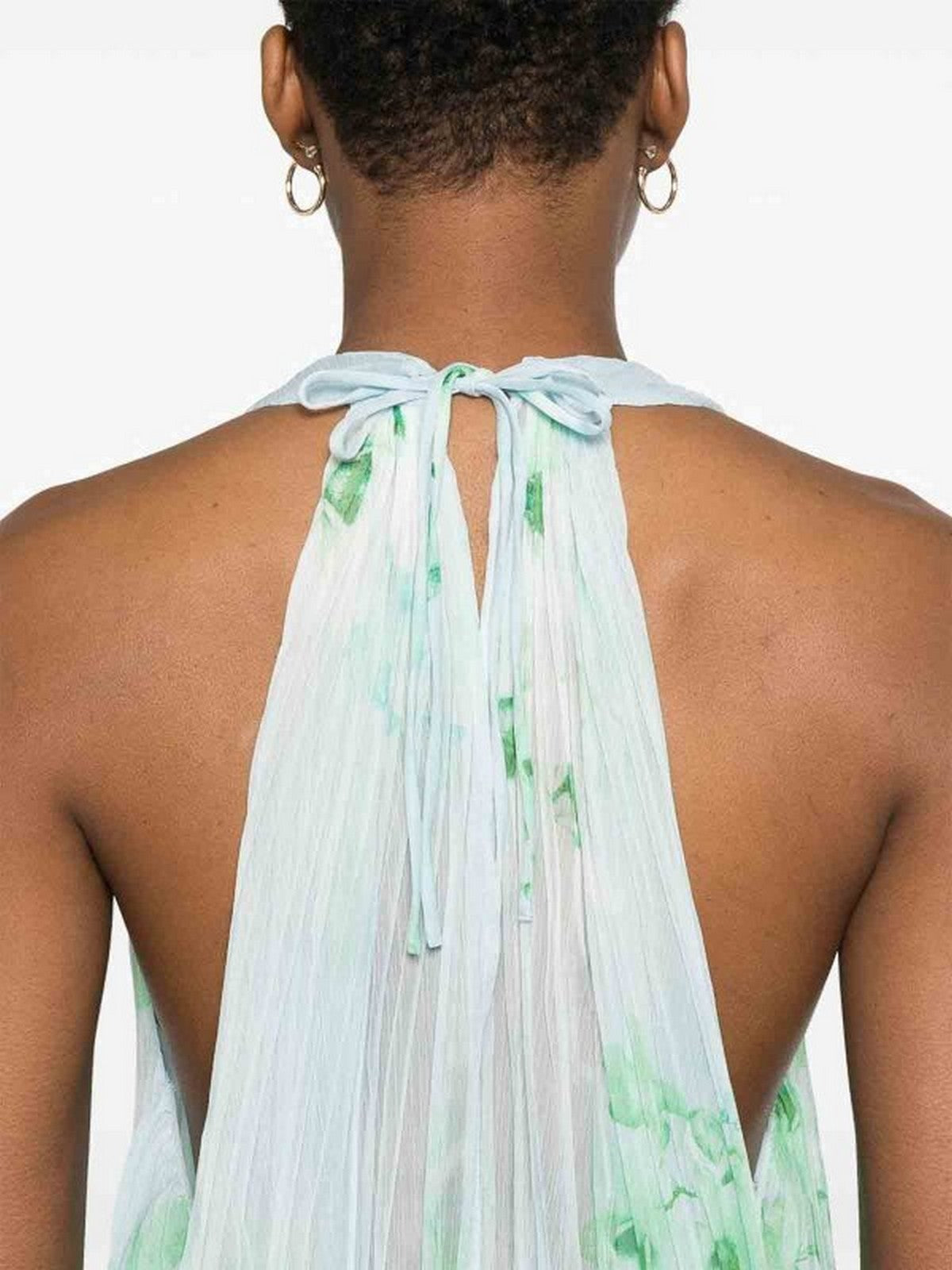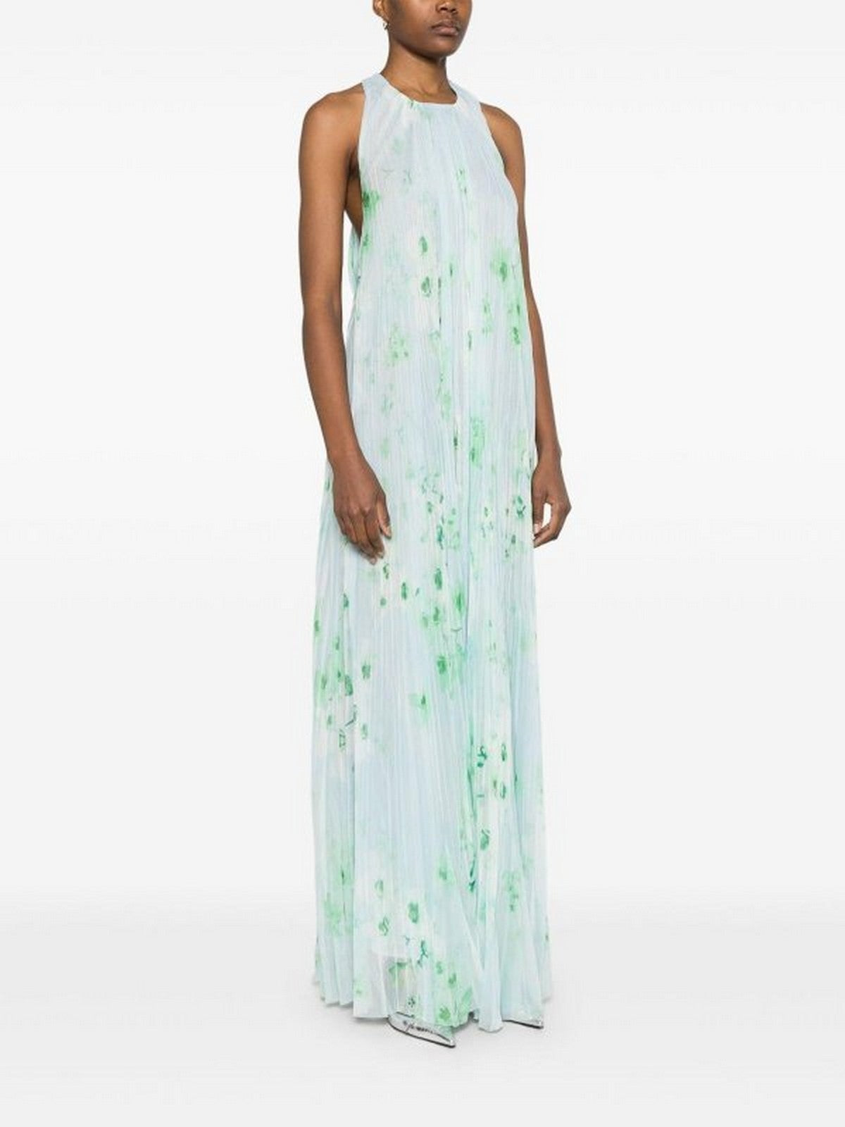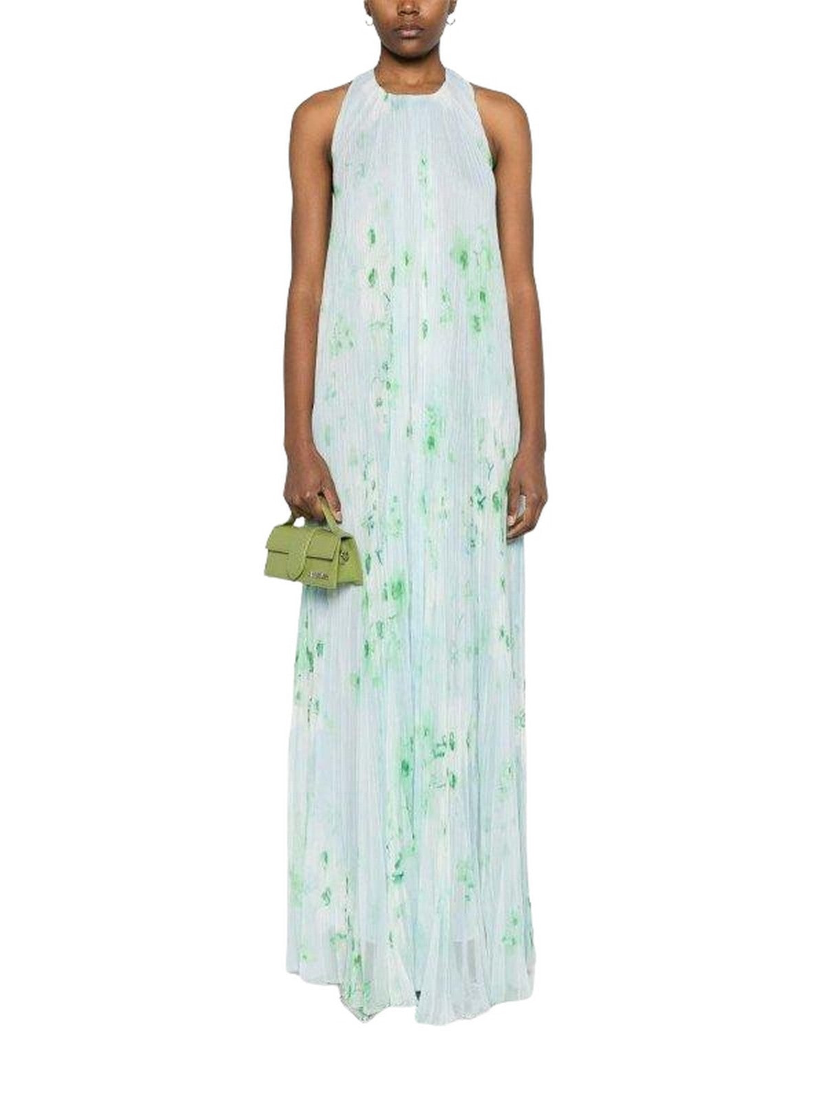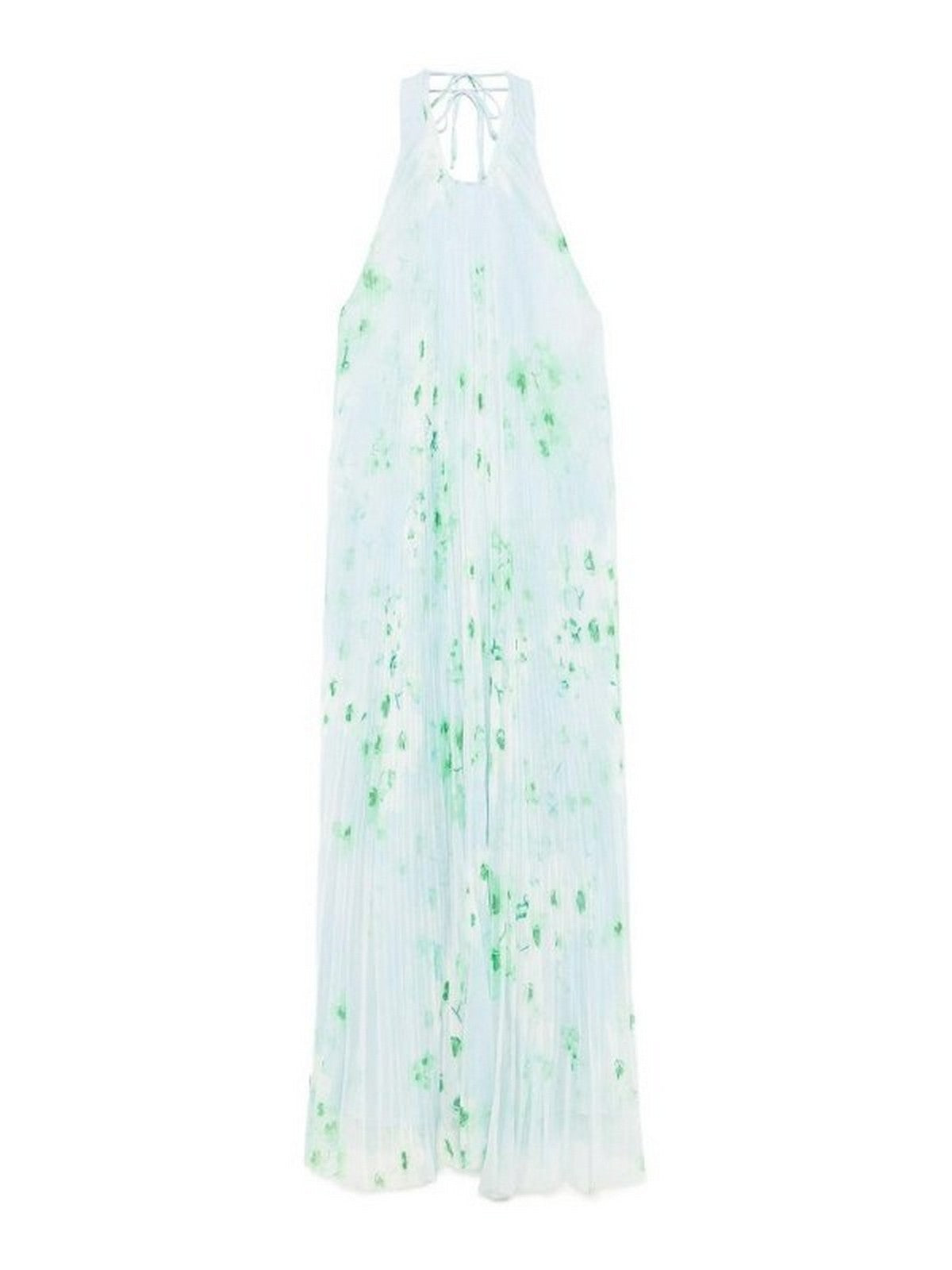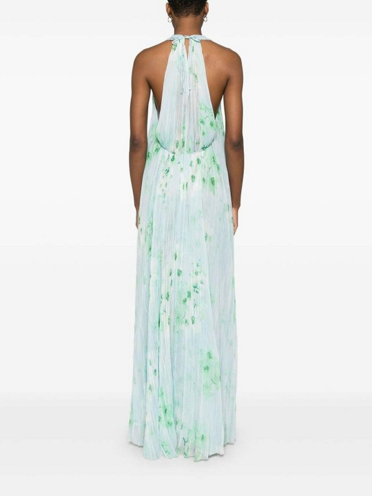 Elegant long dress crafted from lightweight pleated crepon fabric featuring a delicate floral pattern. The sleeveless silhouette of this formal dress is complemented by a halterneck with two small buttons at the back and a partially open back. This special occasion dress stands out for its refined details and distinctive flowing, soft volume, further enhanced by the pleated detailing, which makes every movement special.