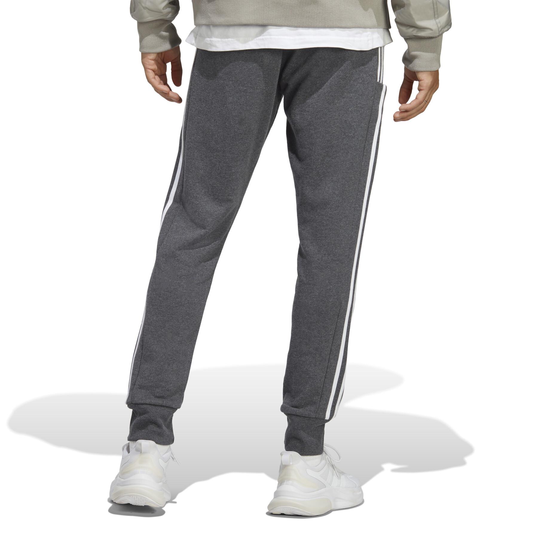 Adidas essentials tracksuit bottoms in French terry (brushed cotton) with three stripes. Versatile and sporty Adidas men's tracksuit bottoms for casual everyday wear. Regular fit, adjustable elastic waistband with drawstring, 100% cotton, side pockets, and ribbed cuffs. Salbini technical sports items is an Adidas retailer.