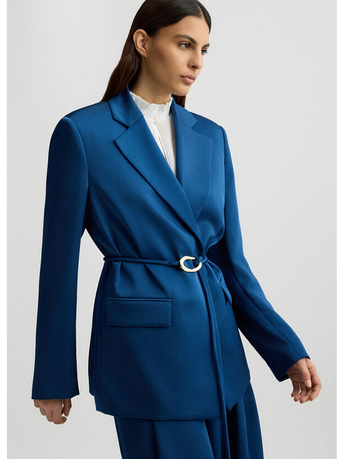 A formal cut reimagined with a glamorous twist: this blazer is ready to steal the show. The elegant satin silhouette is cinched at the waist with a thin jeweled belt, while the matching pockets make it a versatile and casual piece, even for everyday wear.