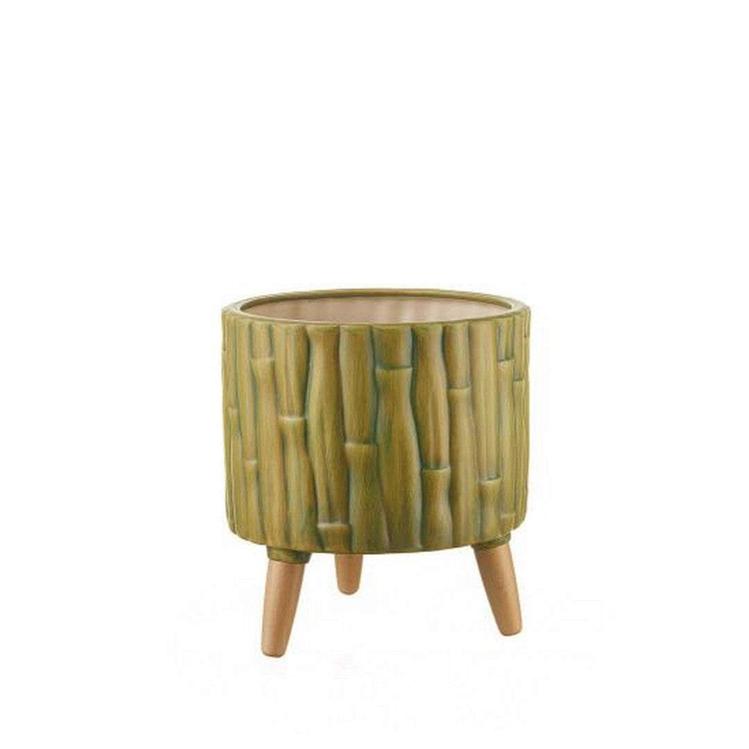 Low ceramic cache-pot with wooden feet. Indoor vase, inspired by the geometry of bamboo, perfect for decorating the house with a green corner. To be combined with the tall version inspired by Ethno Chic for a jungle-style decor.