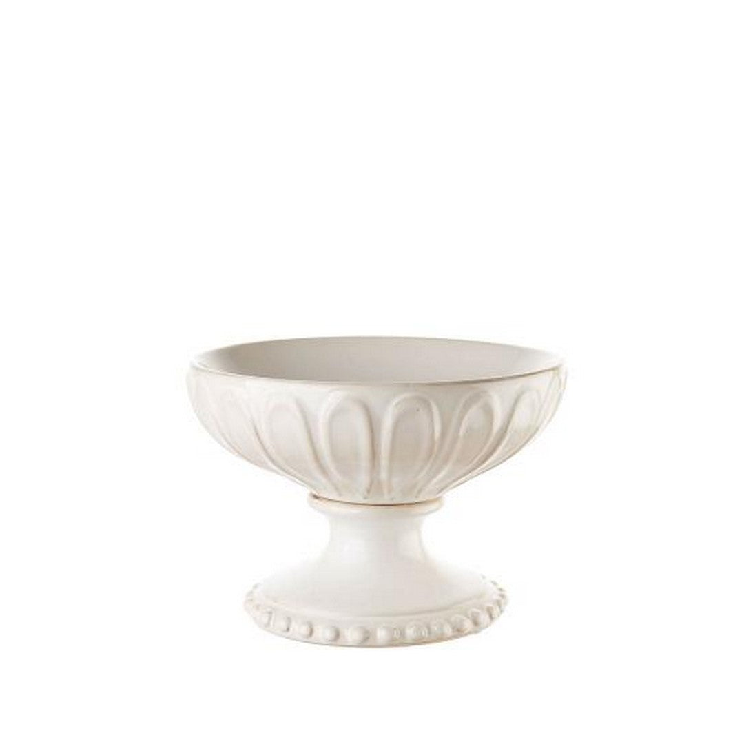 Ceramic centerpiece cup. The delicate relief decoration and the antique effect make it the missing detail in an elegant and welcoming decor. To be combined with the Modern Country-inspired centerpiece with birds to embellish convivial environments.
