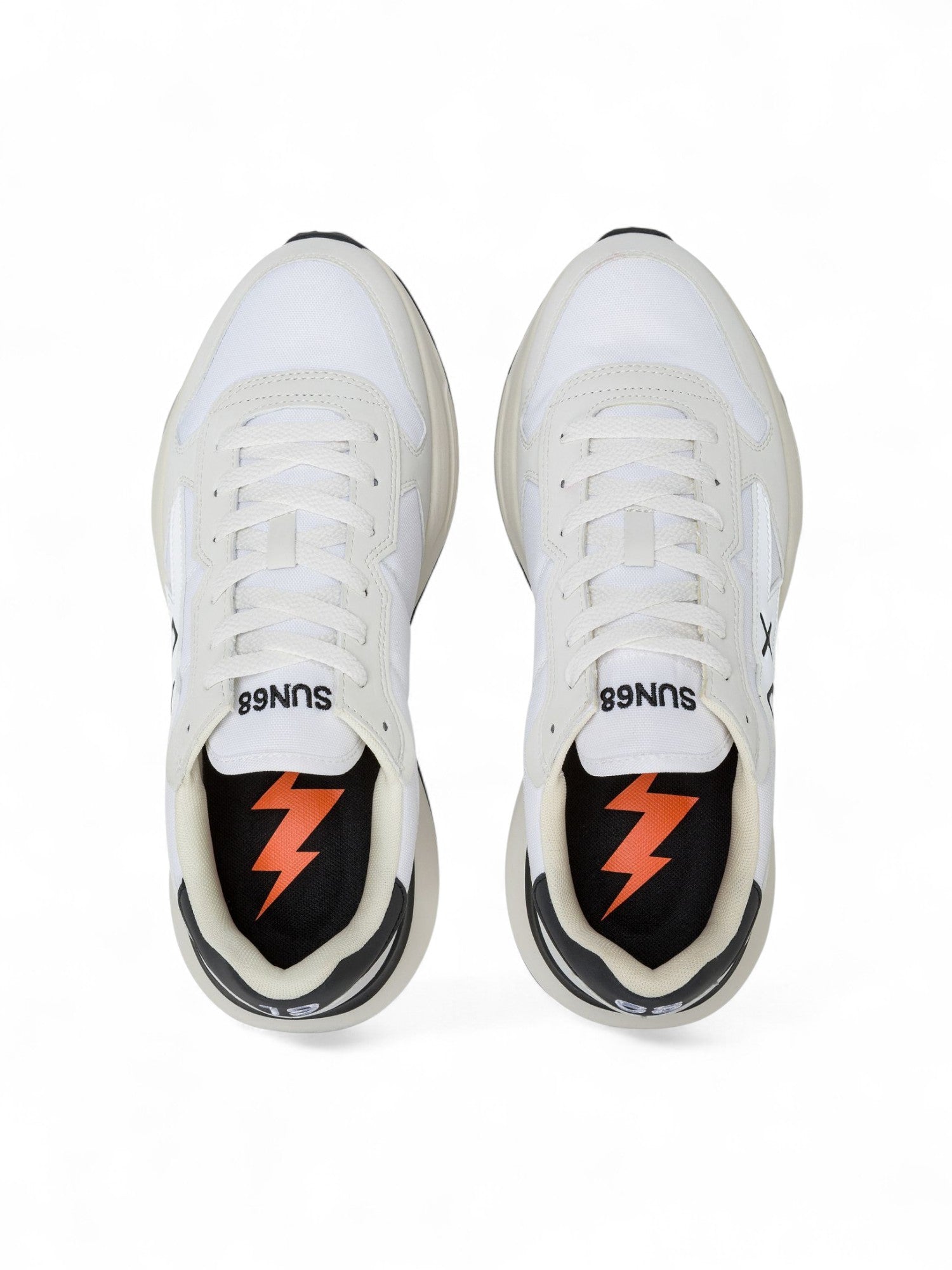 Realizzata in nylon e PU con dettagli in suede, presenta una chiusura con lacci in cotone e una patch laterale a forma di fulmine che reinterpreta in chiave moderna il classico logo SUN68. La suola ultraleggera in phylon con battistrada in gomma garantisce ammortizzazione, stabilità e grip su ogni superficie.