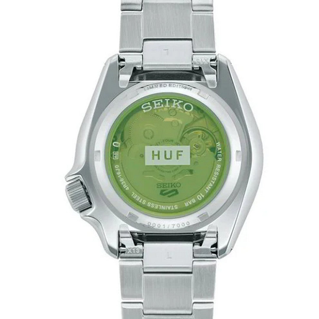 This exclusive model harks back to a classic Seiko 5 Sports from the 1960s, reinterpreted in a bold palette of green, blue and red, specially created by HUF.