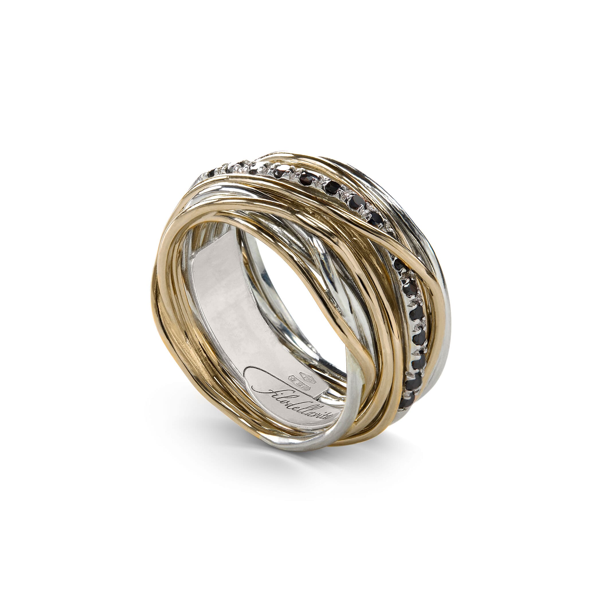 Filodellavita Classic Collection Ring, 13 Strands in 9kt Yellow Gold, .925 Silver and 16 Black Diamonds 0.21 ct