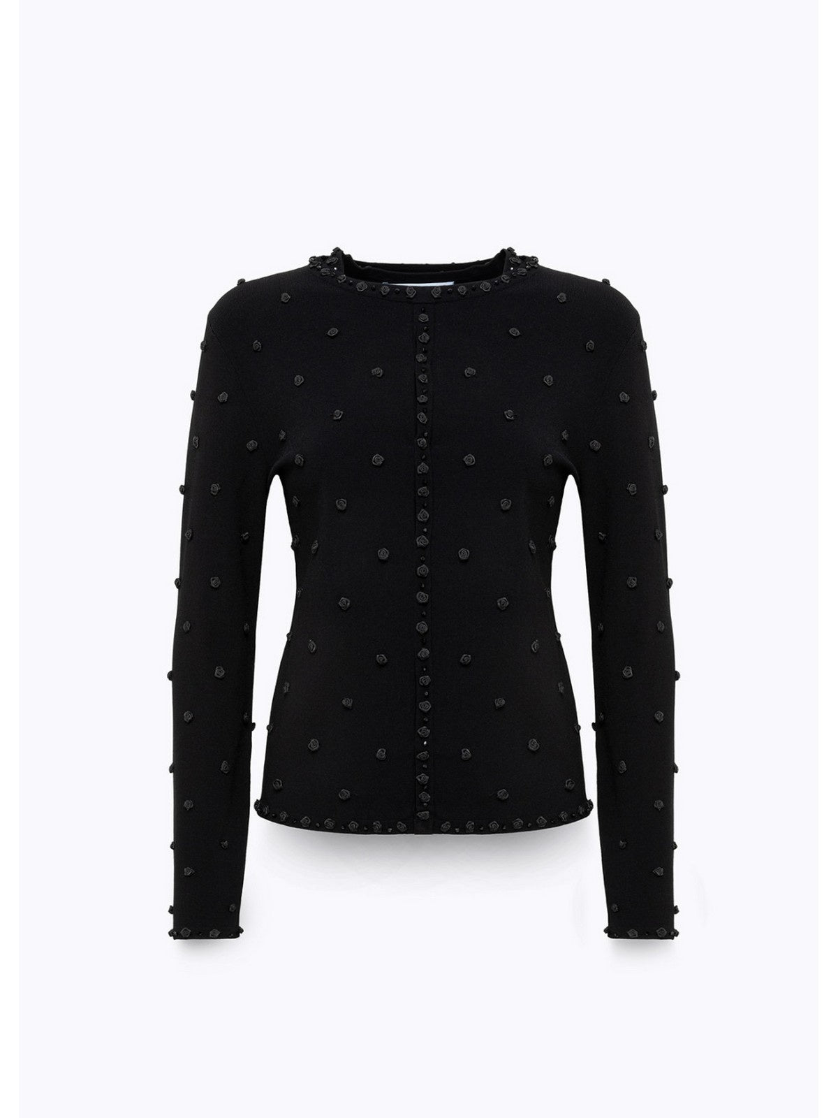 ICONIC ELEGANCE FOR THIS VISCOSE KNIT TWIN-SET EMBROIDERED WITH HAND-APPLIED SATIN ROSES AND PIPING INTERSPERED WITH ROSES WITH MATCHING CORALS. THE STRAIGHT-FIT CARDIGAN FASTENS WITH SNAPS, A ROUND NECK, AND LONG SLEEVES. THE TOP HAS A FITTED LINE AND A WIDE NECKLINE. TO BE INTERPRETED IN A MYRIAD OF SPECIAL LOOKS. COMPOSITION: 83% VISCOSE 17% POLYESTER
