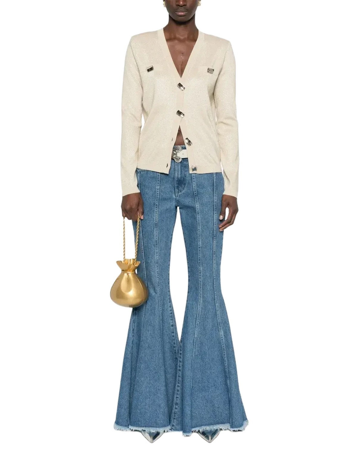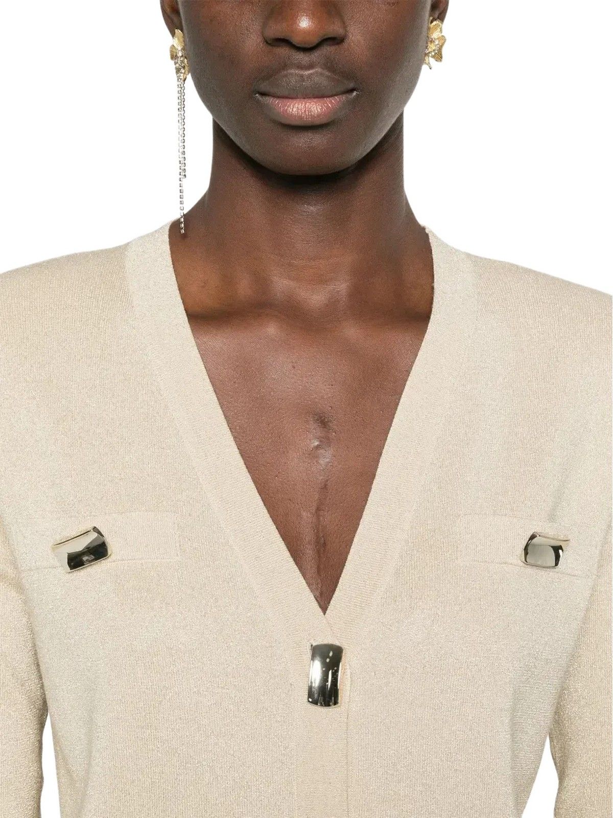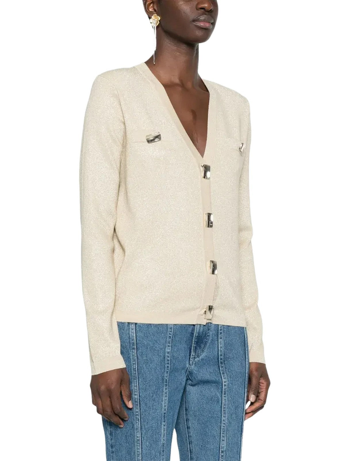 BRIGHTEN UP YOUR STYLE WITH THIS VISCOSE AND LUREX BLEND CARDIGAN EMBELLISHED WITH JEWEL BUTTONS. It features a plain knit V-neck, long sleeves with shoulder pads, solid-color trim, and a regular fit. It pairs perfectly with the matching skirt. COMPOSITION: 57% VISCOSE 27% METALLIC POLYESTER 16% POLYESTER