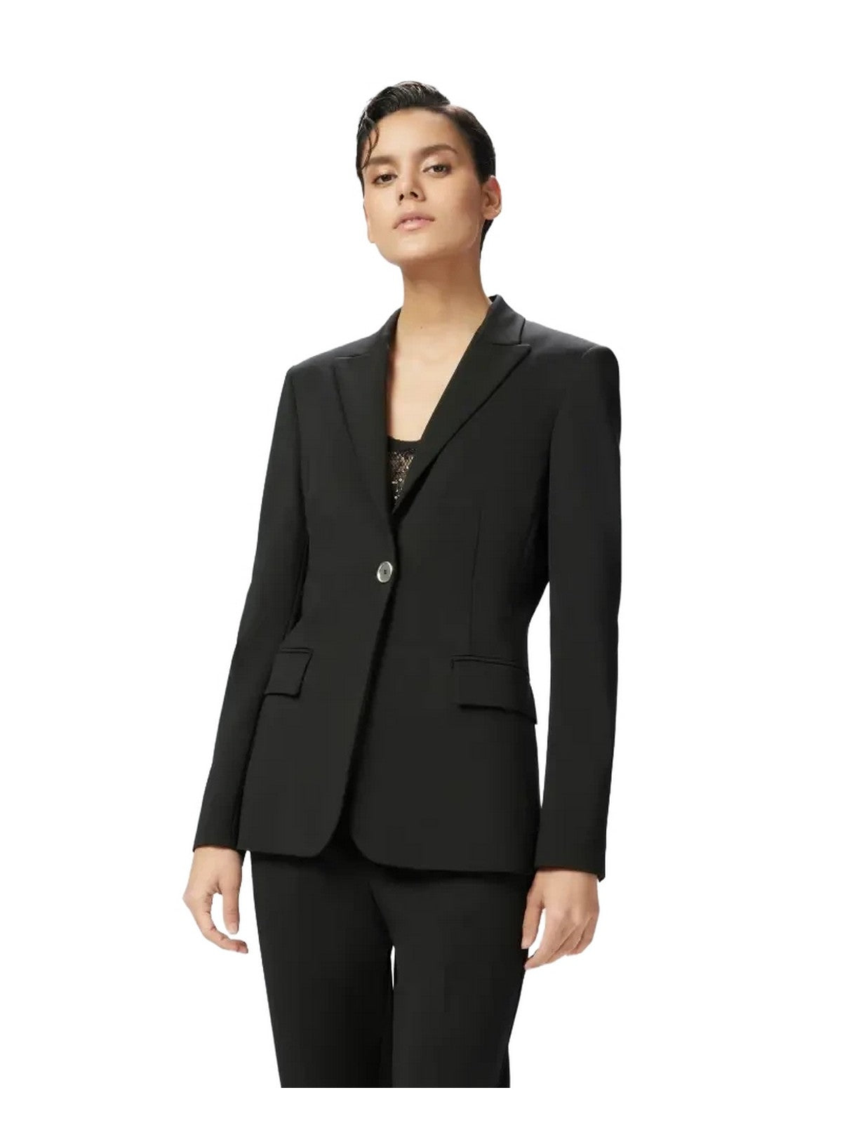Single-breasted fitted blazer jacket in stretch viscose technical fabric with a distinctive scuba-look finish. This piece is made with 52% viscose from responsibly managed forests. The blazer features a lapel collar, long sleeves with metal buttons at the cuffs, and welt pockets with flaps at the sides. The blazer is lined in fabric, and the single-breasted closure is finished with a single metal button for a dazzling, original touch. This jacket is the perfect ally for any look requiring an elegant touch: wear it with a suit, with a pair of separates, or over a dress for a formal occasion. Outer fabric: VISCOSE 73% LINEN 27% - Lining: ACETATE 65% VISCOSE 35%
