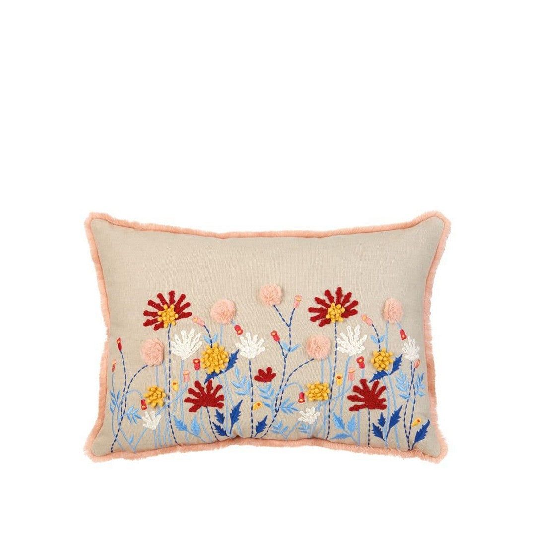 Rectangular cotton decorative cushion with appliques and embroidery. The modern floral decoration and a pleasant-to-the-touch texture make it an elegant addition to your living room. Ideal for pairing with the matching square floral cushion and geometric cushion, inspired by Modern Country. Removable cover.