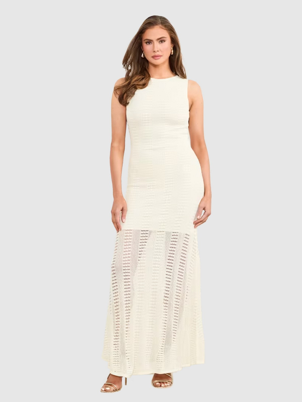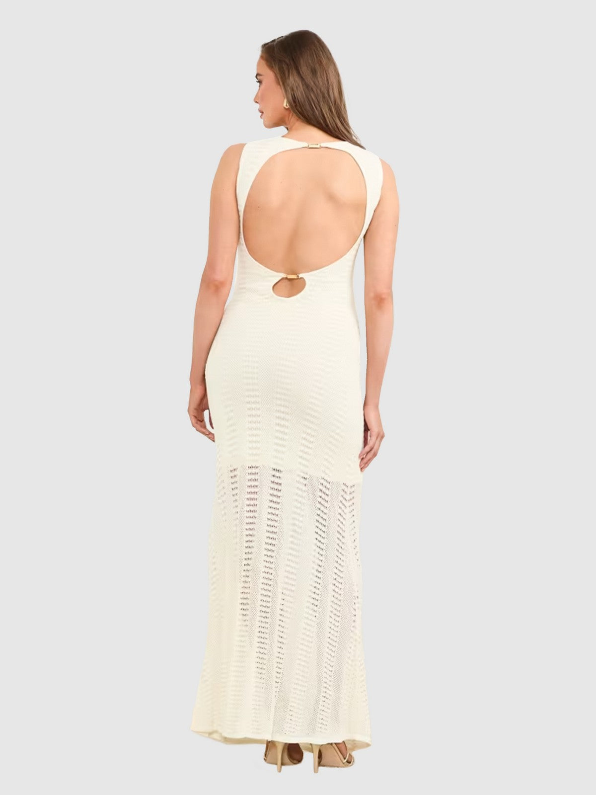 Complete the look with a pair of gold pumps and a matching clutch. The ensemble is perfect for an elegant event, combining sophistication and class in a timeless dress.