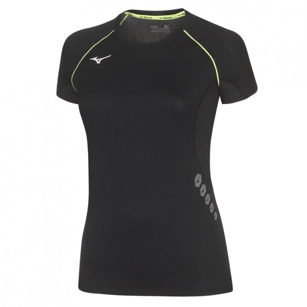 Mizuno women's running T-shirt. Mizuno short-sleeved running shirt in lightweight, breathable fabric with Mizuno DRYLITE® technology, jacquard mesh on the side for improved performance, Hex Runbird print, and contrasting neon details. Salbini, technical sportswear.
