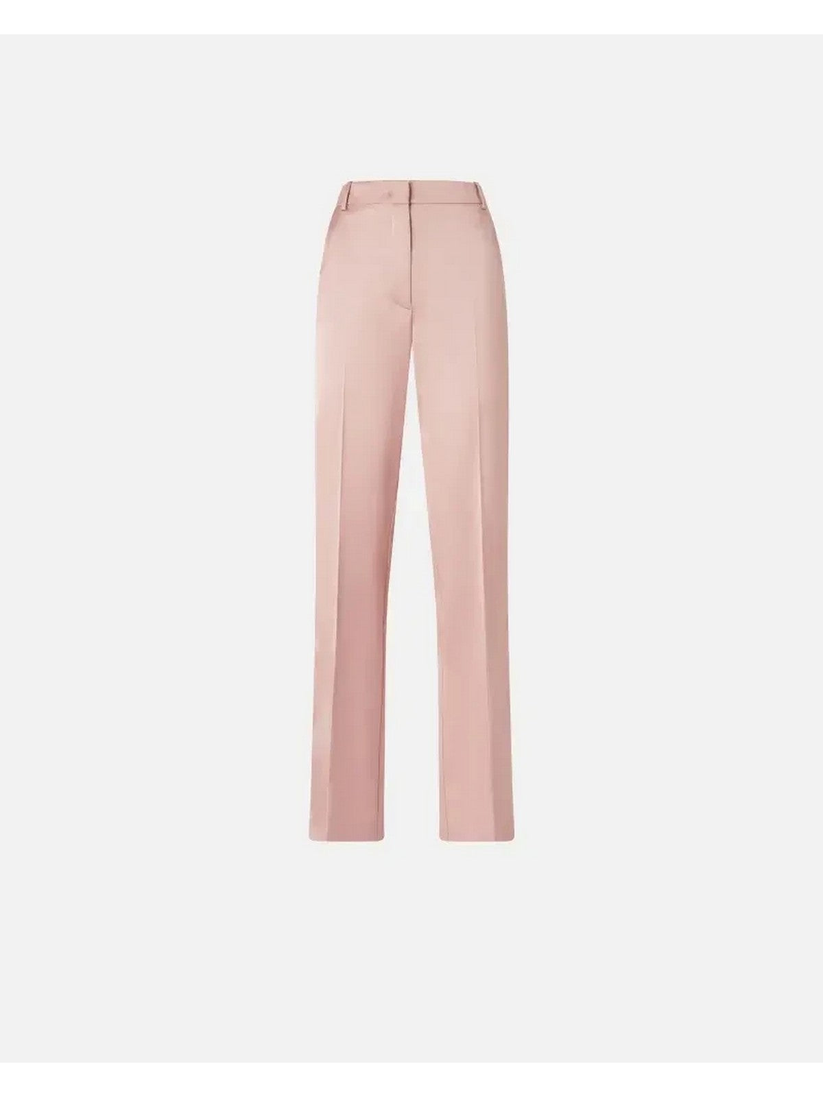 Elegant women's long trousers in shiny cotton and stretch viscose satin with a distinctive slub finish, giving the garment an uneven, almost artisanal feel. These formal trousers feature a straight, slightly wide leg, complemented by a center pleat at both the front and back, adding a tailored touch and refined detail. The tops of the trousers are finished with belt loops to personalize your look, slanted side pockets, and a concealed zip and hook closure. Complete your look for a special occasion, wedding, or party by wearing these satin trousers with a matching blazer, cinched at the waist with a matching belt, for a feminine outfit perfect for spring.