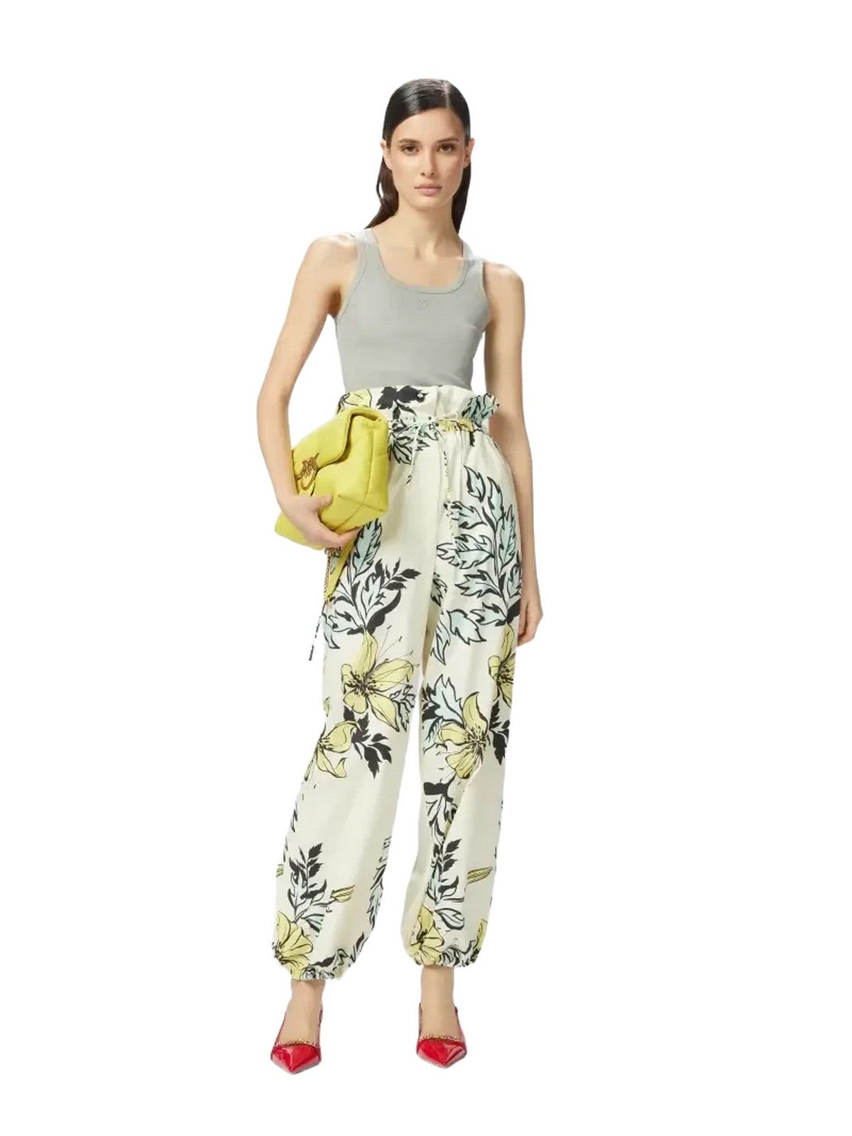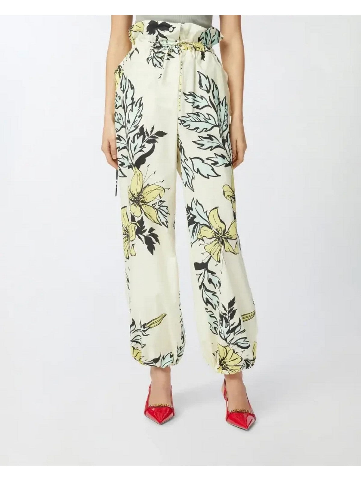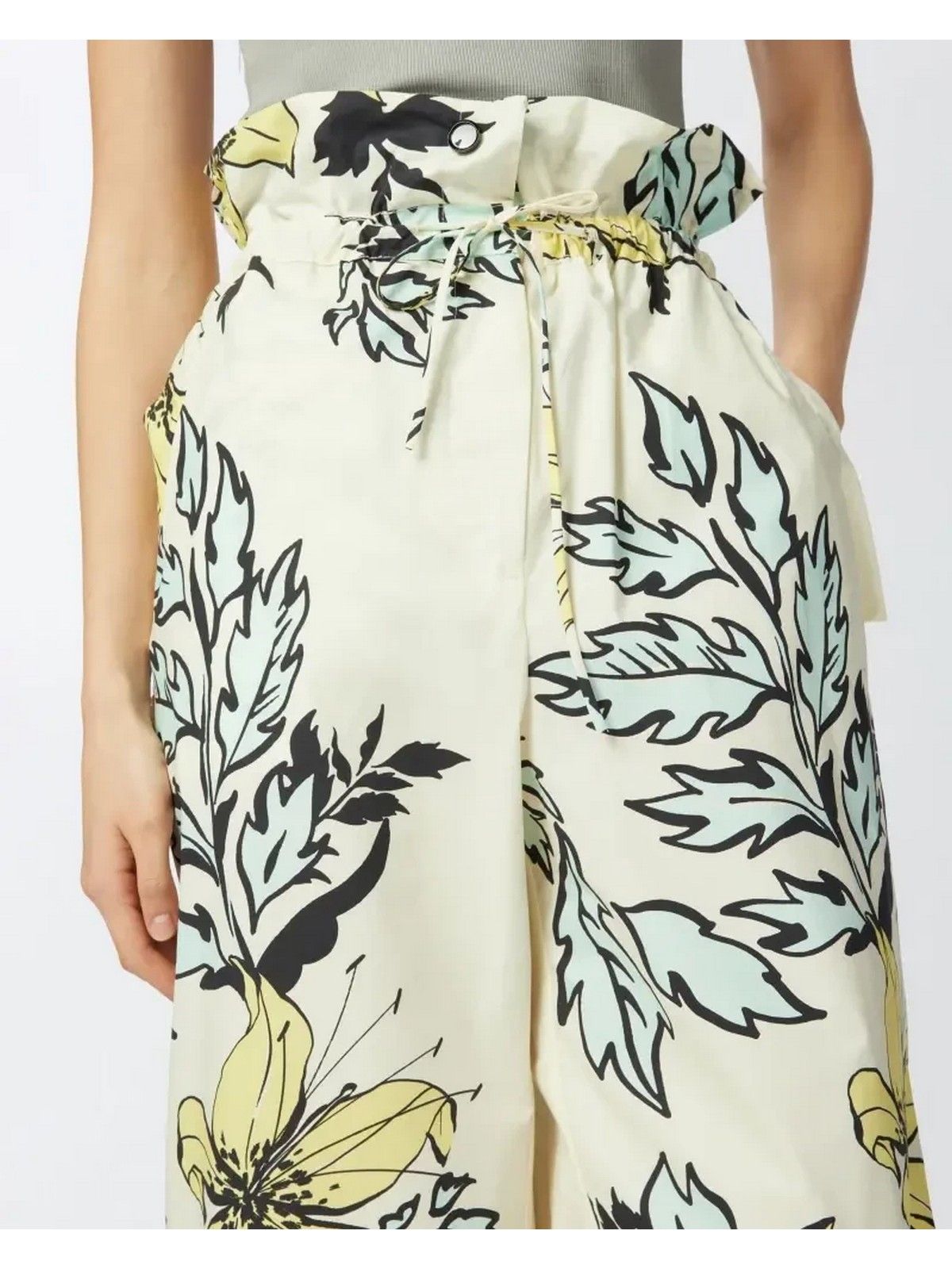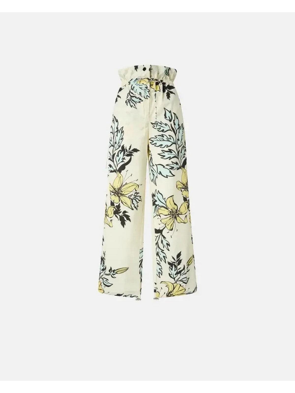 Wide-leg daytime trousers crafted from pure cotton poplin with a lily flower print for a light, refined, and summery touch. These floral trousers feature a straight, wide leg and a high, sack-style waist with a slight gather and an inserted drawstring to tighten or loosen the volume, customizing the fit to your liking. They feature a hidden zip and button closure. The femininity of the floral print combines with a summery silhouette and a fresh fabric, creating a pair of wide-leg trousers perfect for everyday wear.