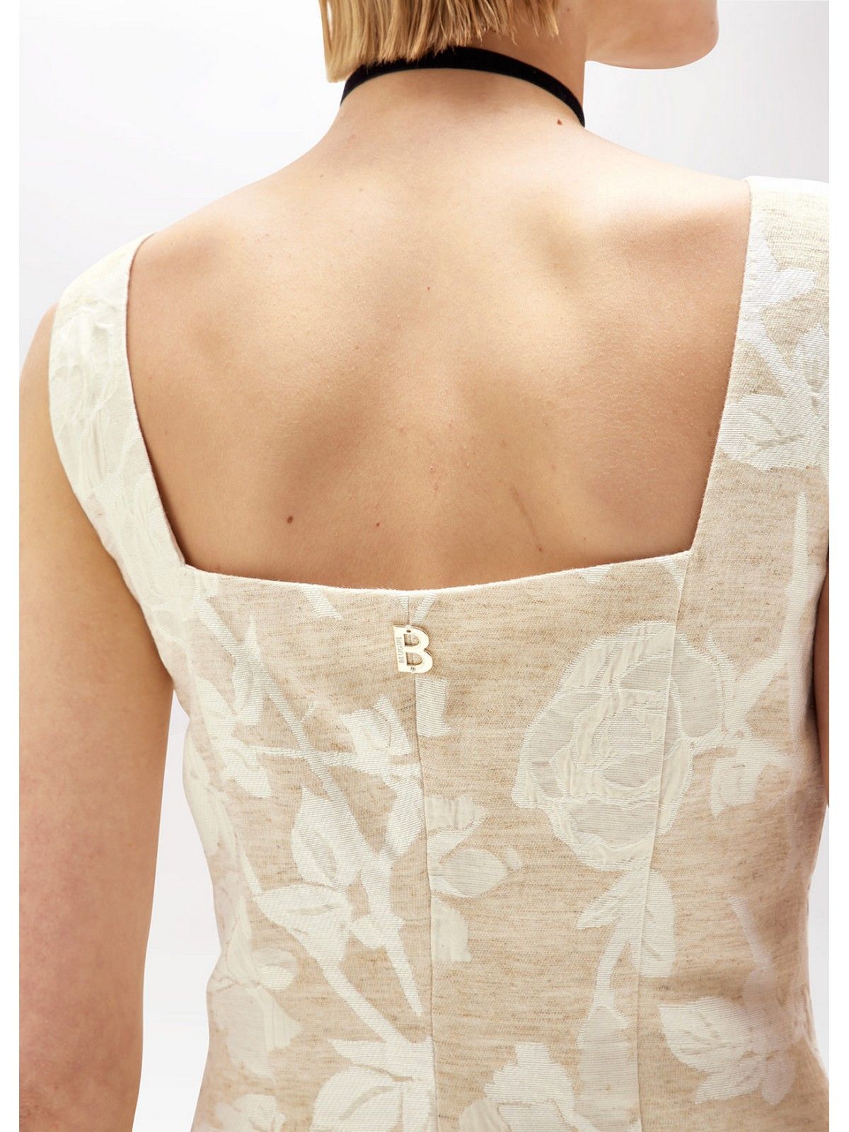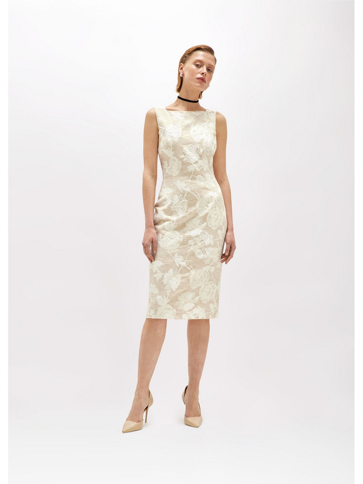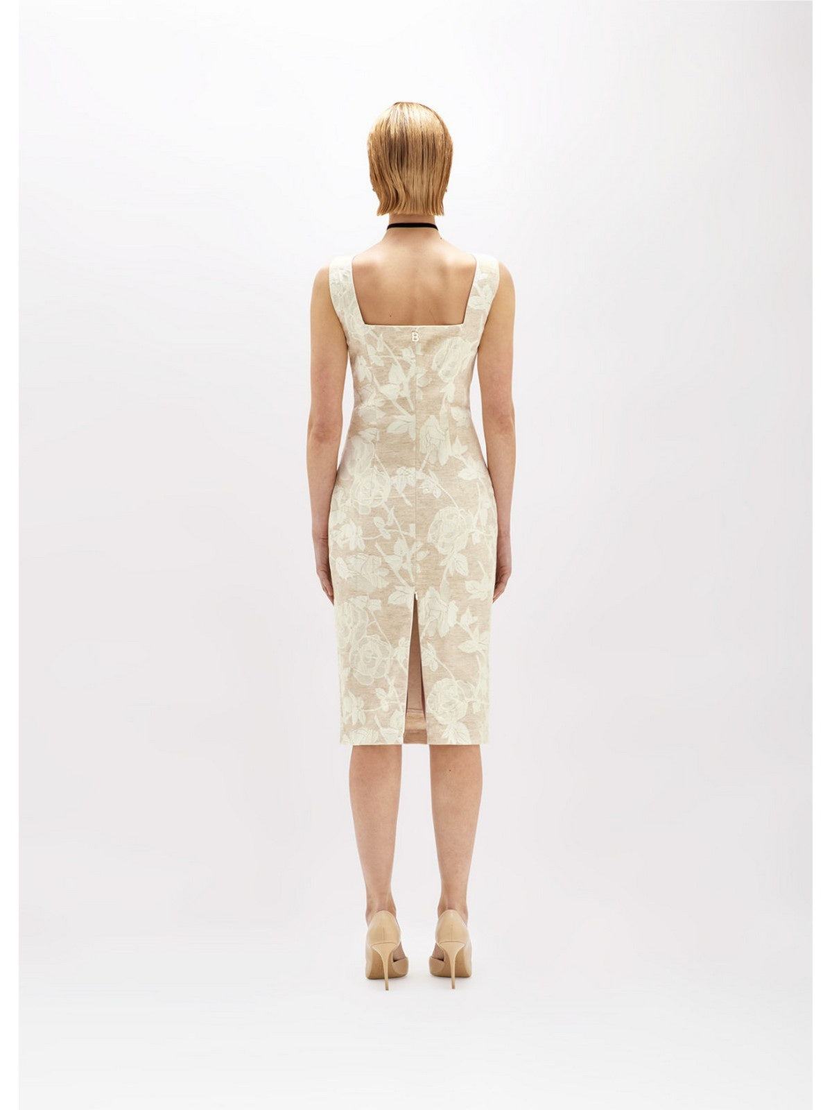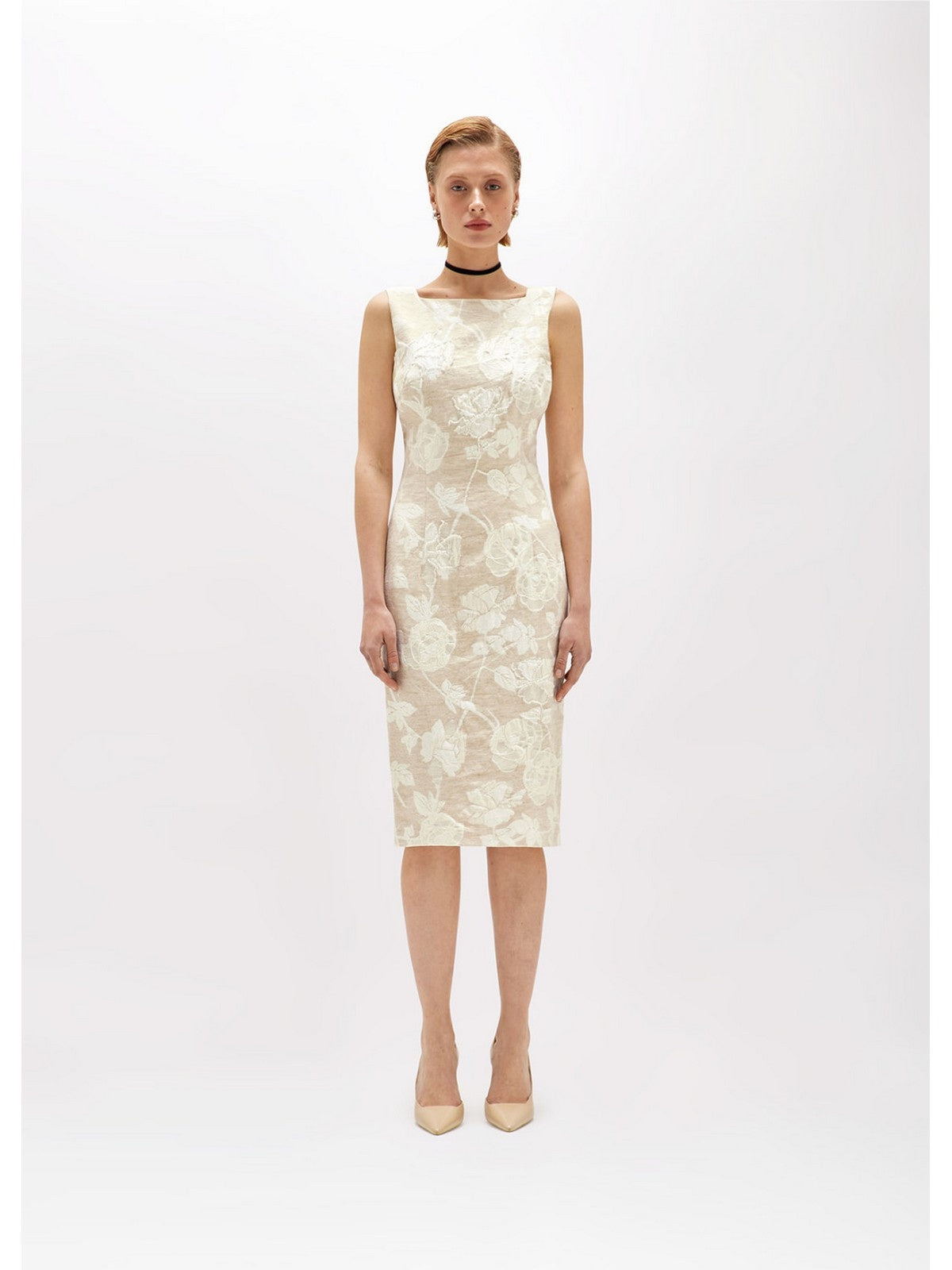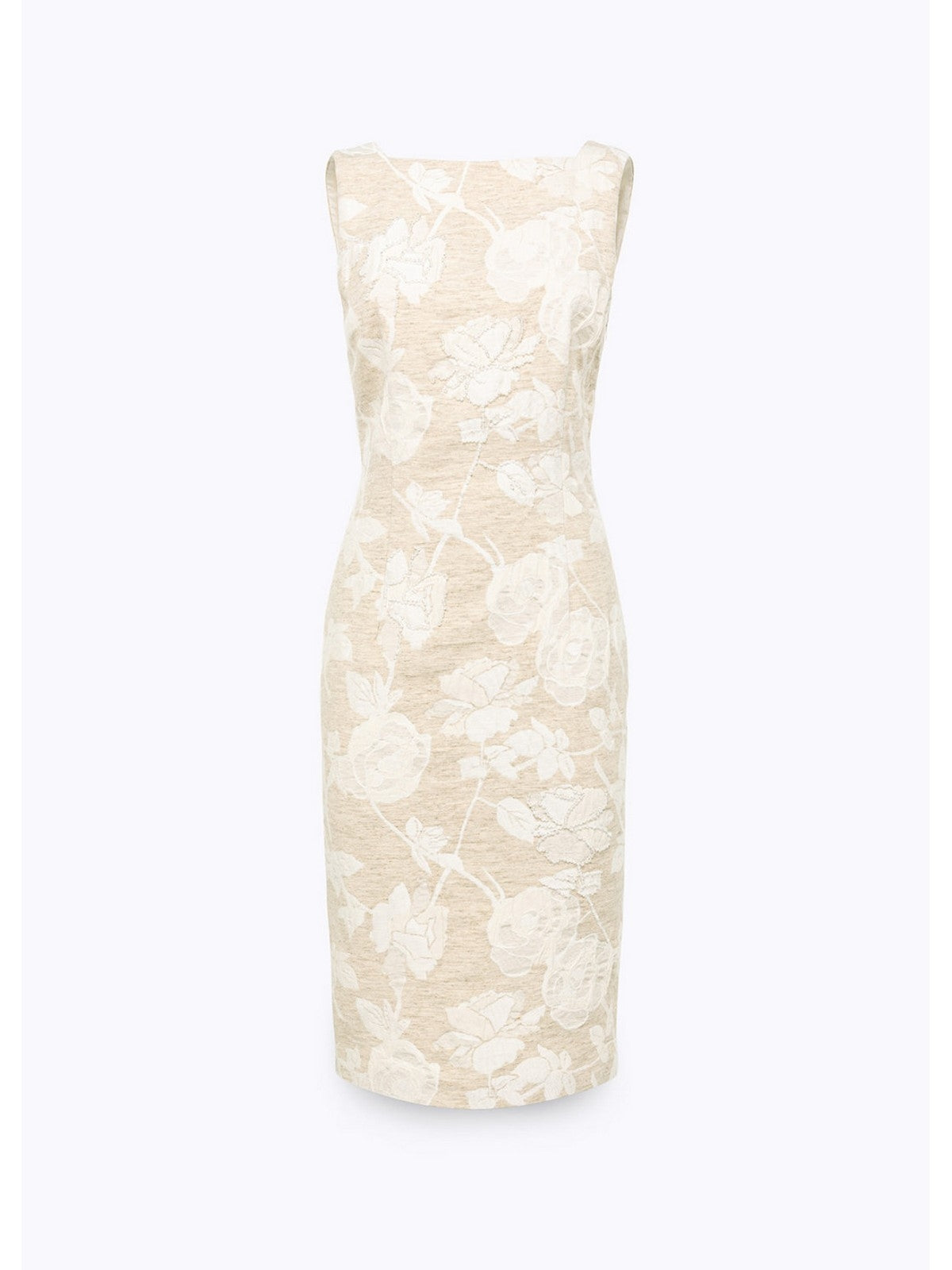 THE SHEATH DRESS IS UPDATED WITH THIS JACQUARD DRESS WITH A FLORAL PATTERN AND LIGHT TONE-ON-TONE EMBROIDERY. IT HAS A SQUARE COLLAR IN THE FRONT AND BACK, A ZIP CLOSURE AT THE SIDE, AND AN ADJUSTABLE BACK SLIT WITH A ZIP. THE IDEAL OPTION FOR EVENTS AND CEREMONIES, TO BE COMBINED WITH THE MATCHING BOXY JACKET. COMPOSITION: 63% COTTON 27% VISCOSE 10% LINEN