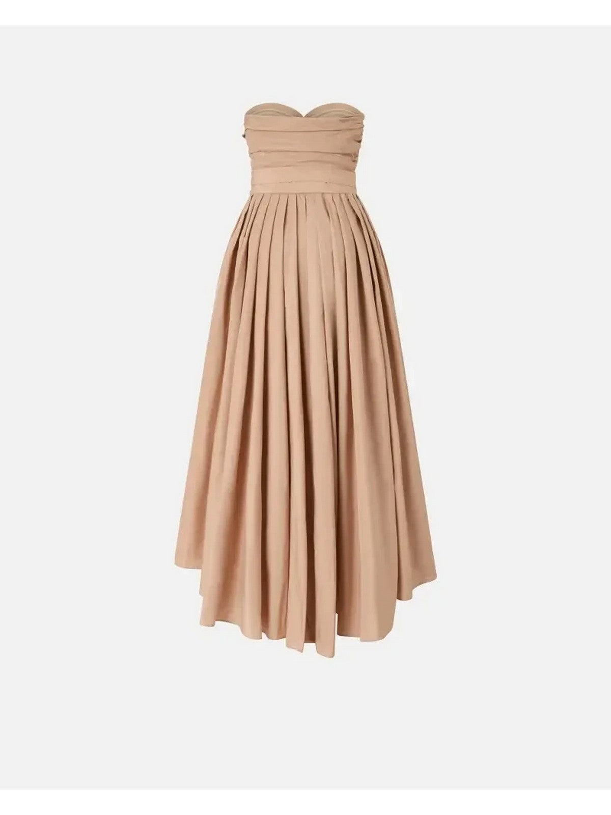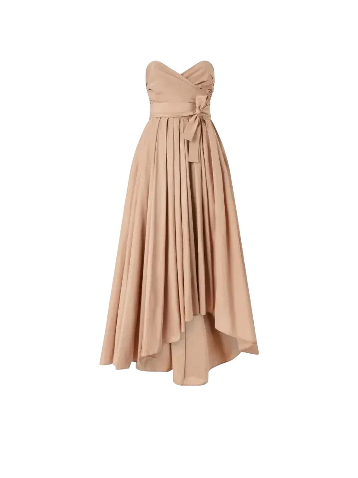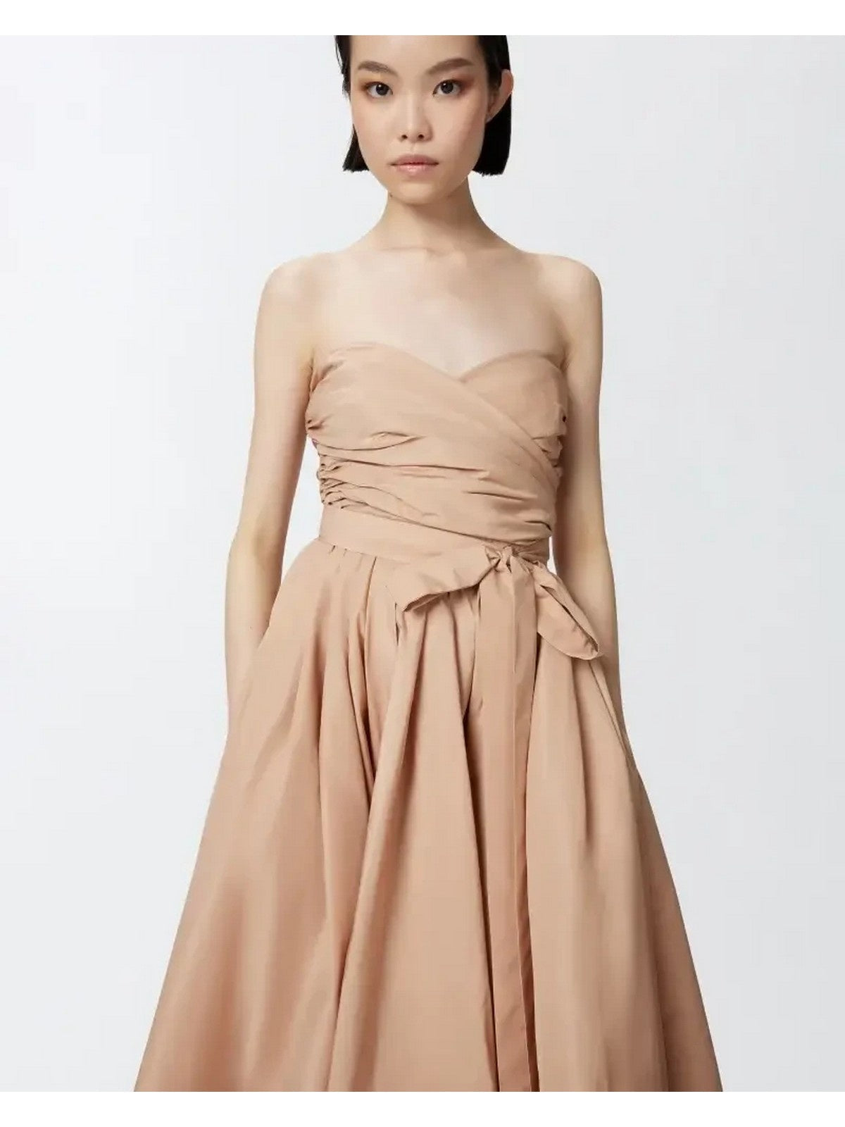 Sleeveless midi dress crafted from taffeta, a fabric that lends itself particularly well to creating geometric shapes and special effects. This elegant dress features a strapless bodice with a crossover sweetheart neckline and a voluminous, softly pleated skirt, slightly shorter in the front to frame the elegant shoes you choose to pair with it. Distinctive details include a sash belt that ties high on the bodice to accentuate the silhouette and add a special touch, and inset pockets at the sides. Thanks to its distinctive design and fabric, this dress will become the star of your seasonal ceremonies. COLOR: CAMEO PINK